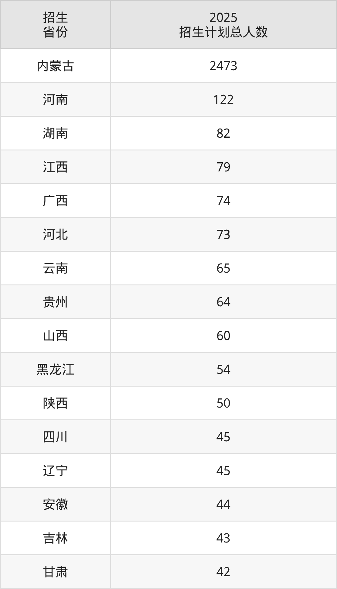 2025年内蒙古民族大学面向全国26个省市开展本科招生;招生专业共52个,招生人数共3591人。2025年在内蒙古自治区招生计划总人数是2473人,其中,内蒙古民族大学在内蒙古自治区招生人数最多的是电子信息科学与技术。内蒙古民族大学在各省具体招生人数情况如下表。