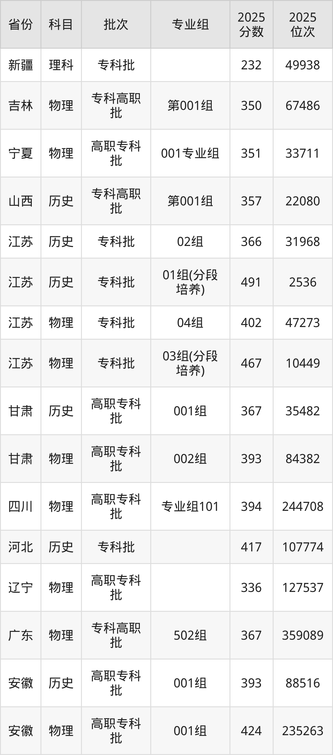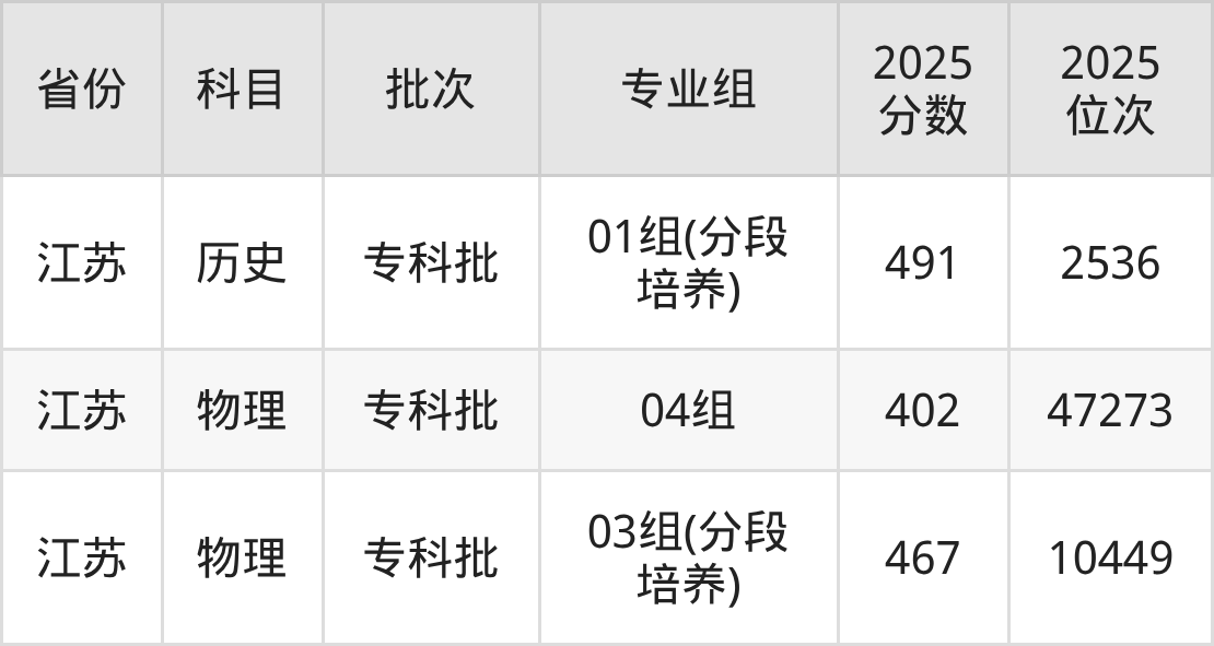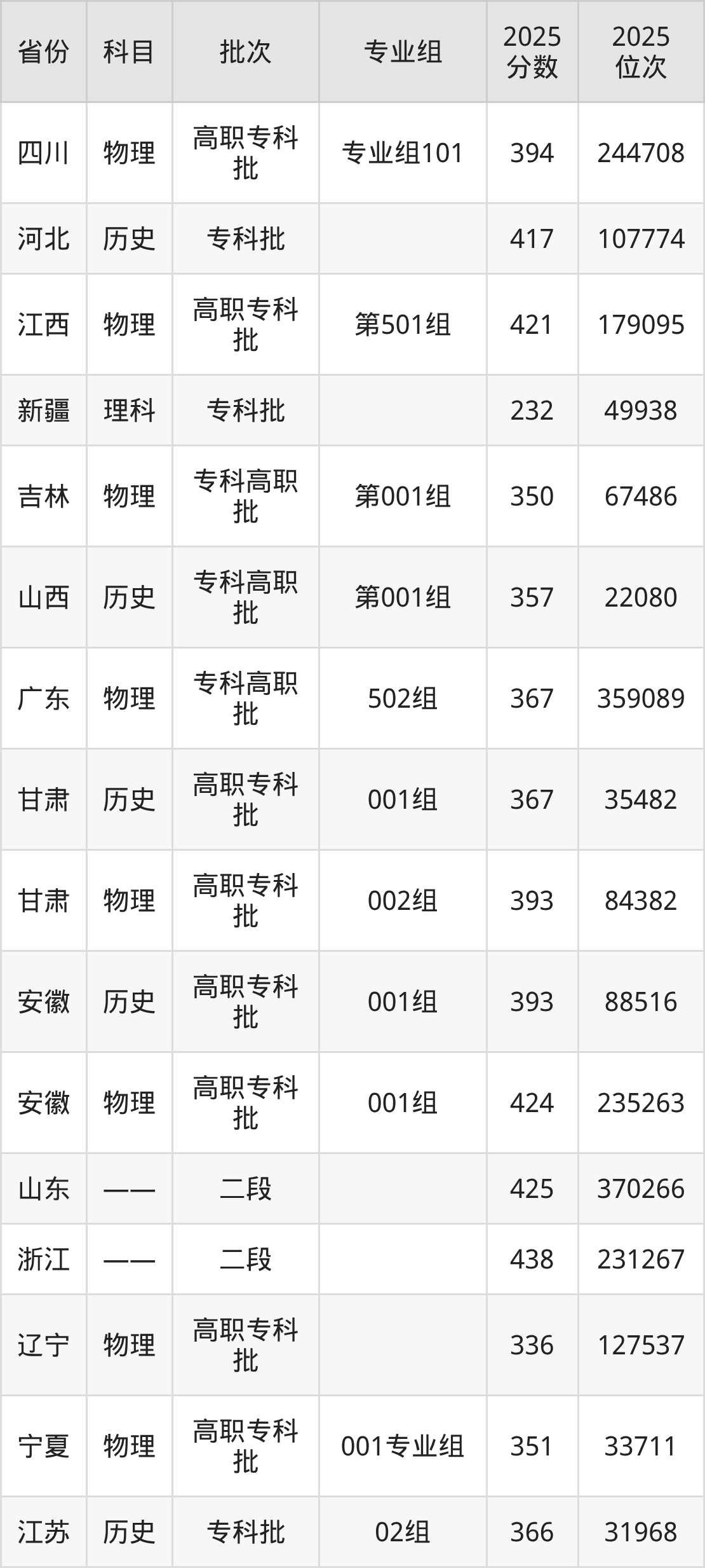 2025年在专科物理类进行招生,各专业组分数线详情如下: