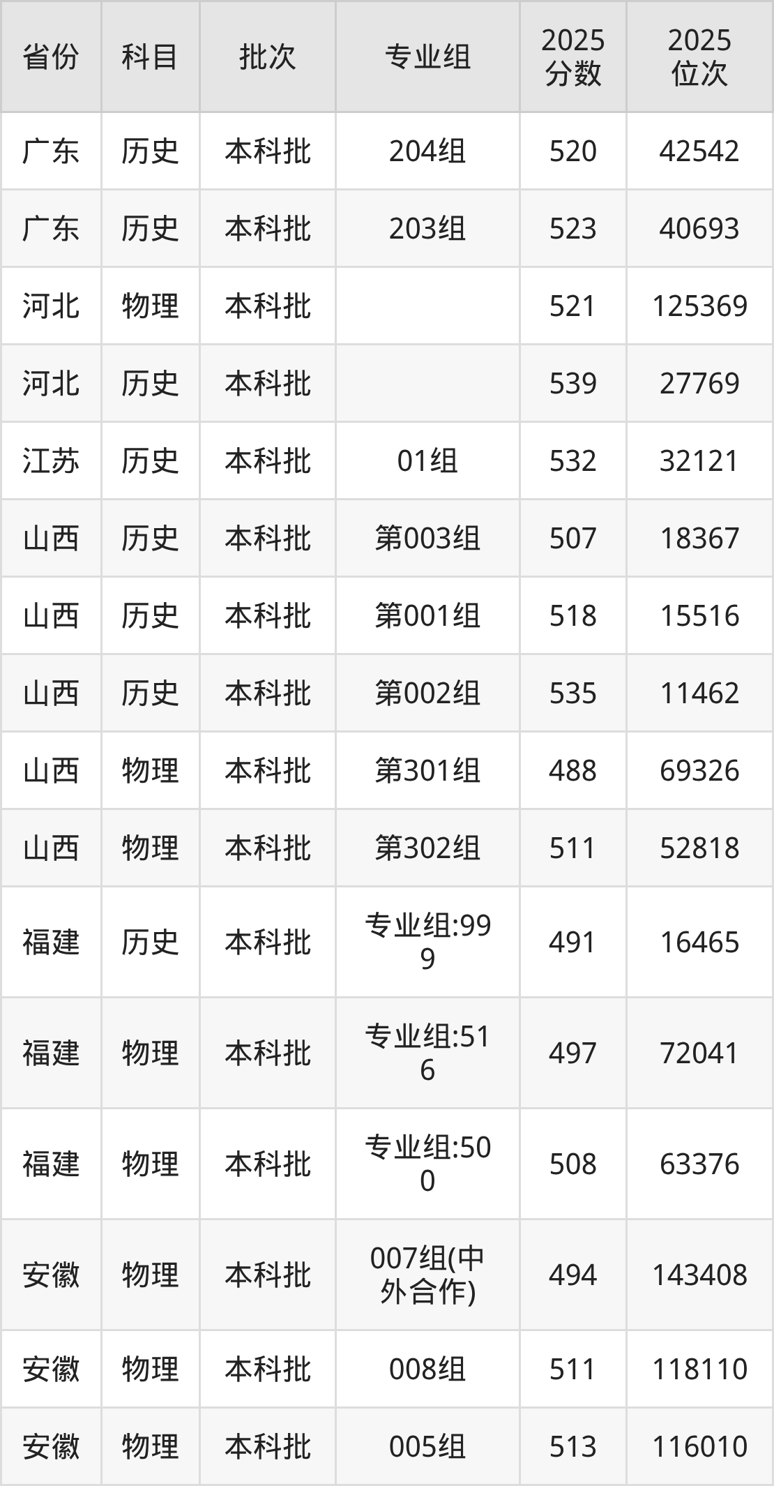 2025年在本科历史类进行招生,各专业组分数线详情如下: