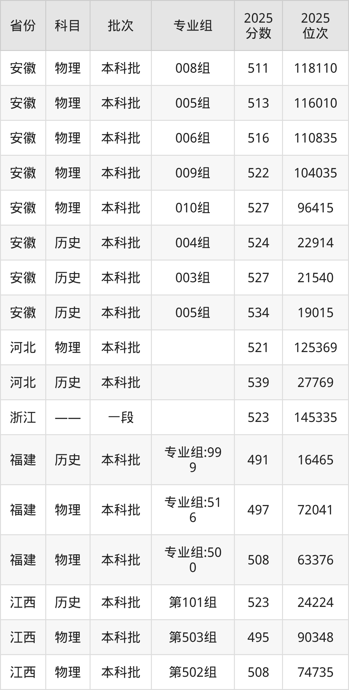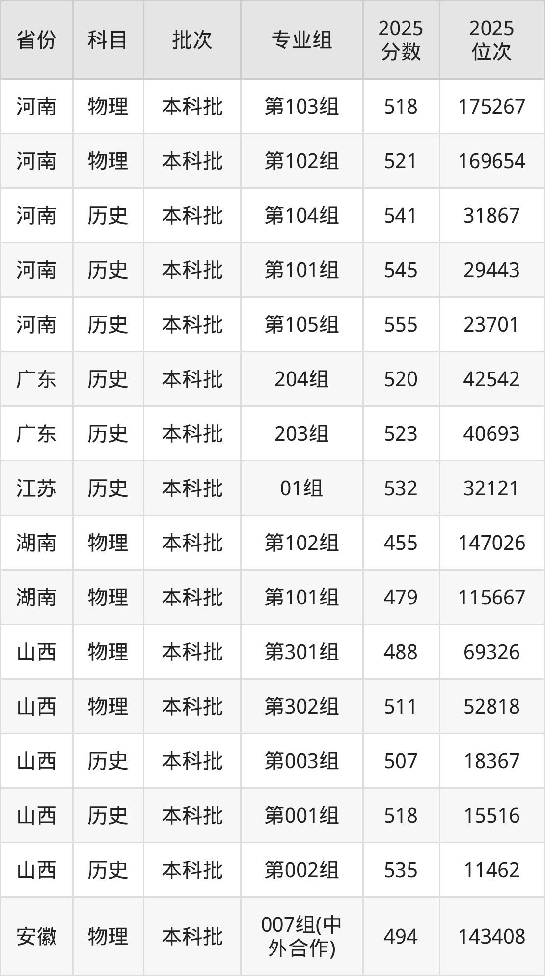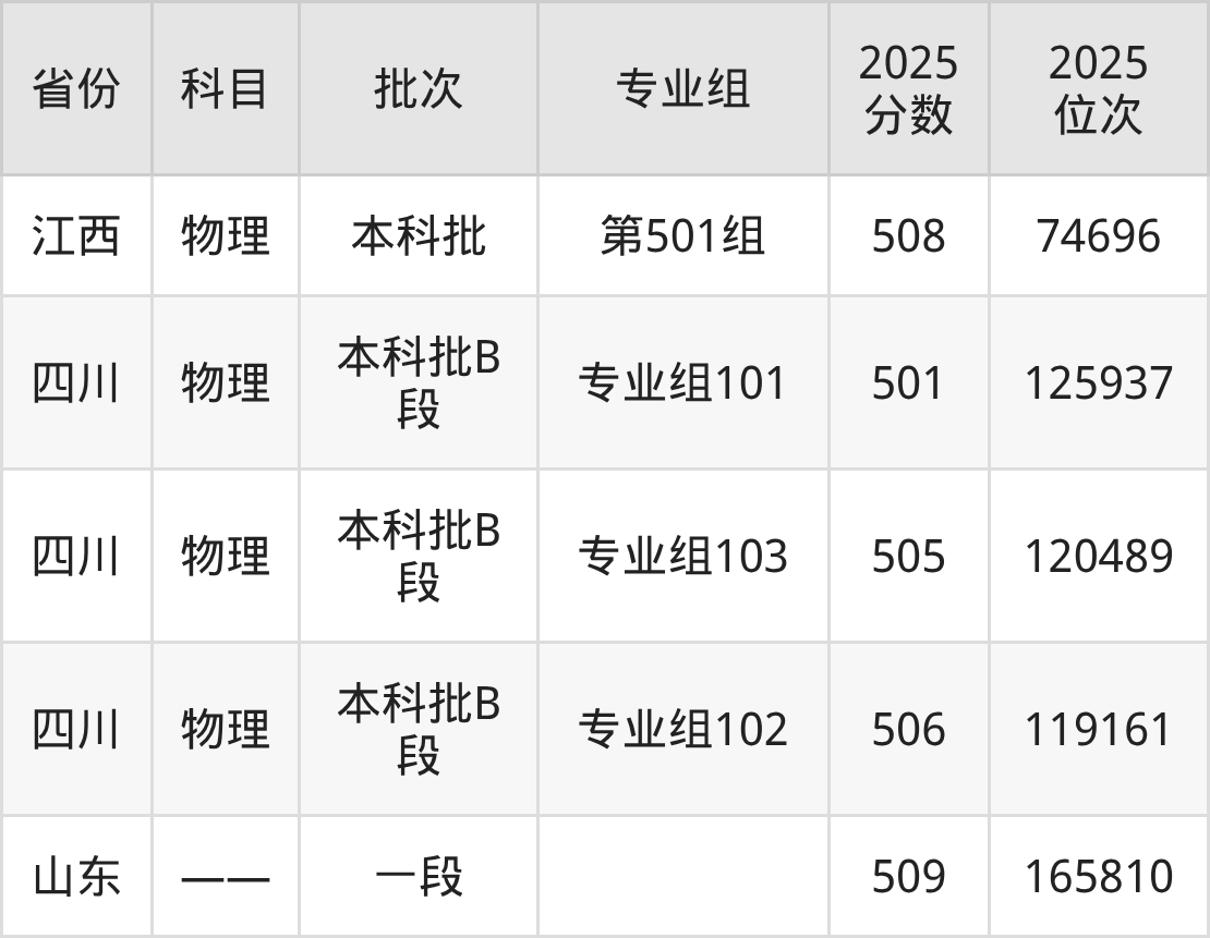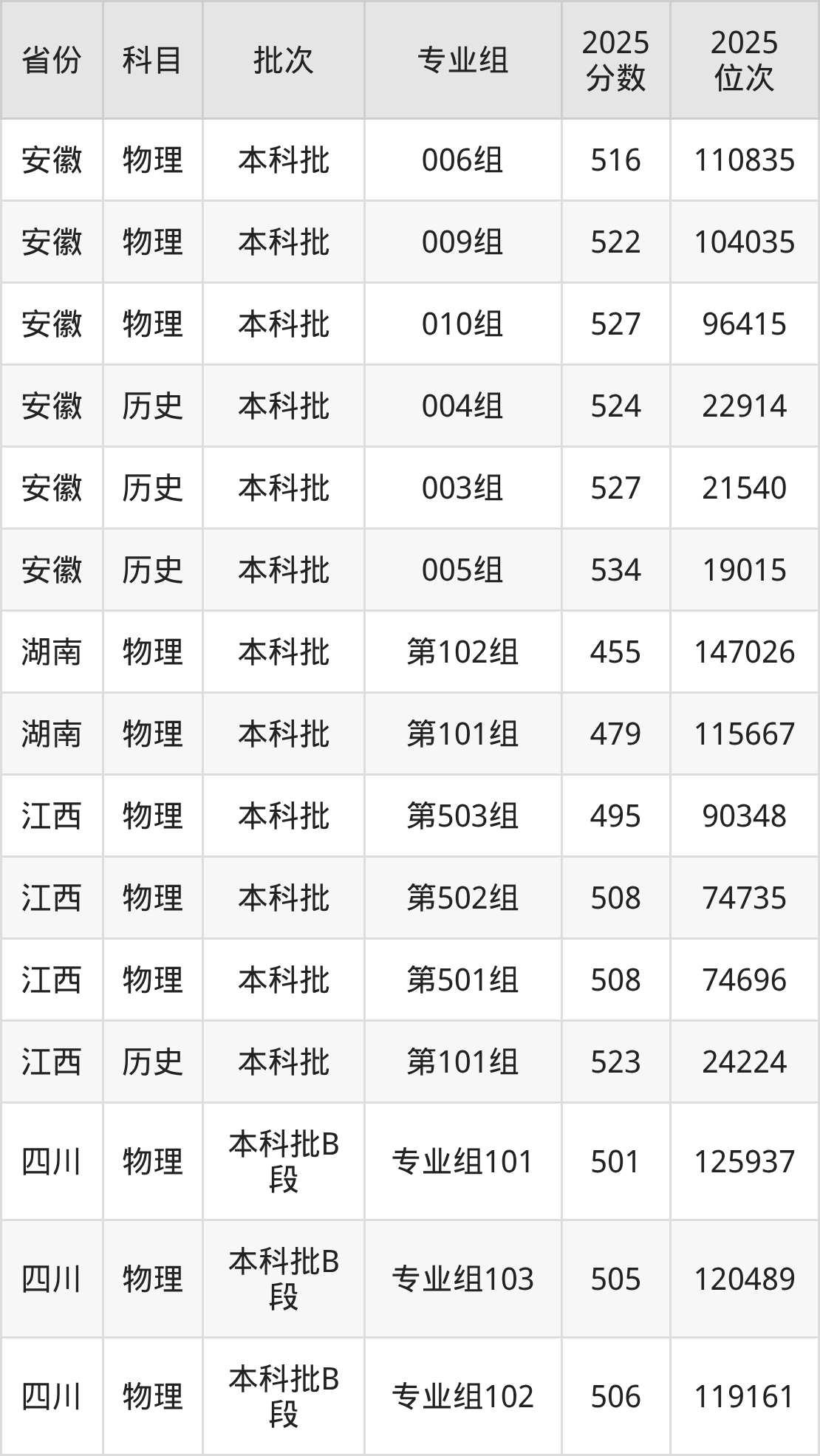 2025年在本科物理类进行招生,各专业组分数线详情如下: