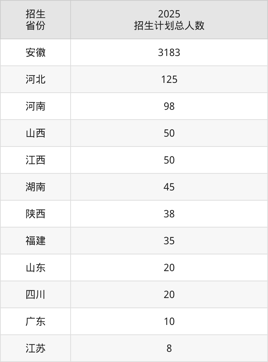 2025年合肥师范学院面向全国12个省市开展本科招生;招生专业共38个,招生人数共3682人。