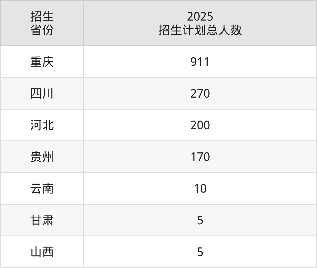2025年重庆公共运输职业学院面向全国7个省市开展专科招生;招生专业共39个,招生人数共1571人。2025年在重庆市招生计划总人数是911人,其中,重庆公共运输职业学院在重庆市招生人数最多的是铁道运输类。重庆公共运输职业学院在各省具体招生人数情况如下表。