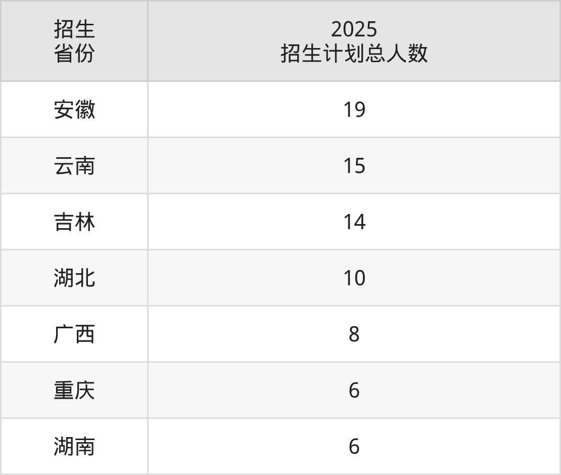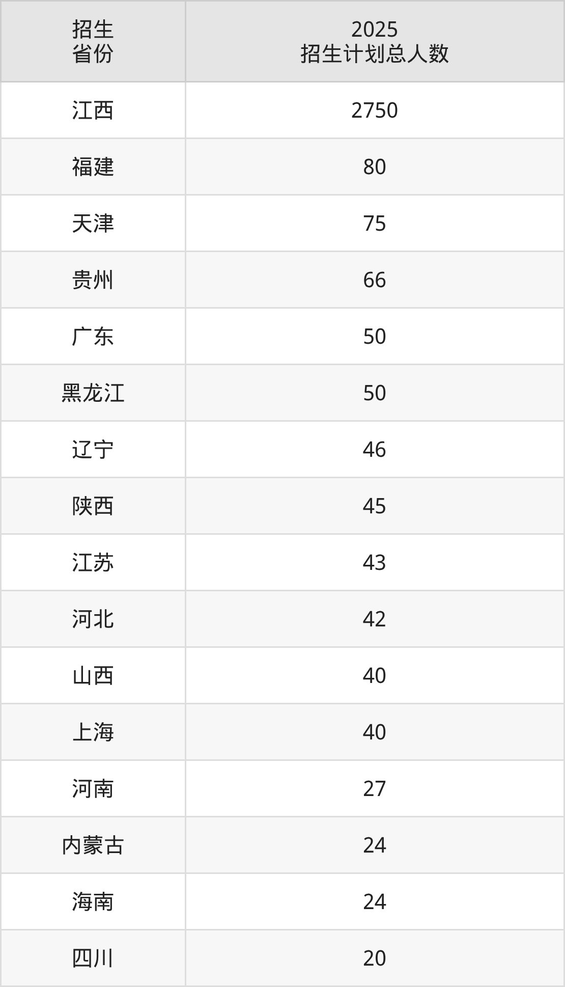 2025年南昌大学科学技术学院面向全国23个省市开展本科招生;招生专业共29个,招生人数共3500人。2025年在江西省招生计划总人数是2750人,其中,南昌大学科学技术学院在江西省招生人数最多的是机械设计制造及其自动化。南昌大学科学技术学院在各省具体招生人数情况如下表。