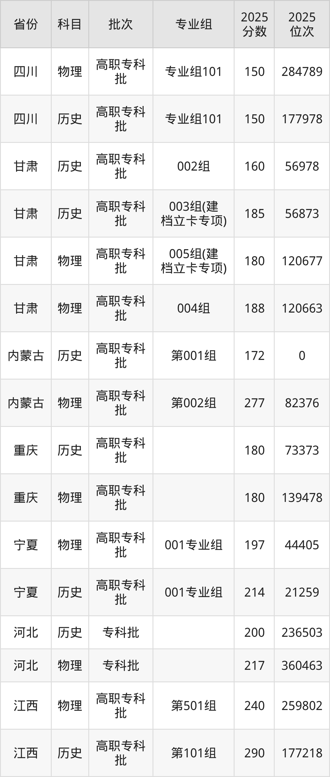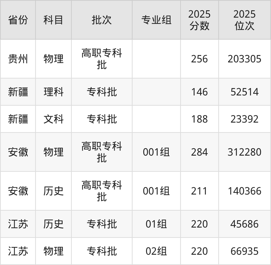2025年在专科物理类进行招生,各专业组分数线详情如下:
