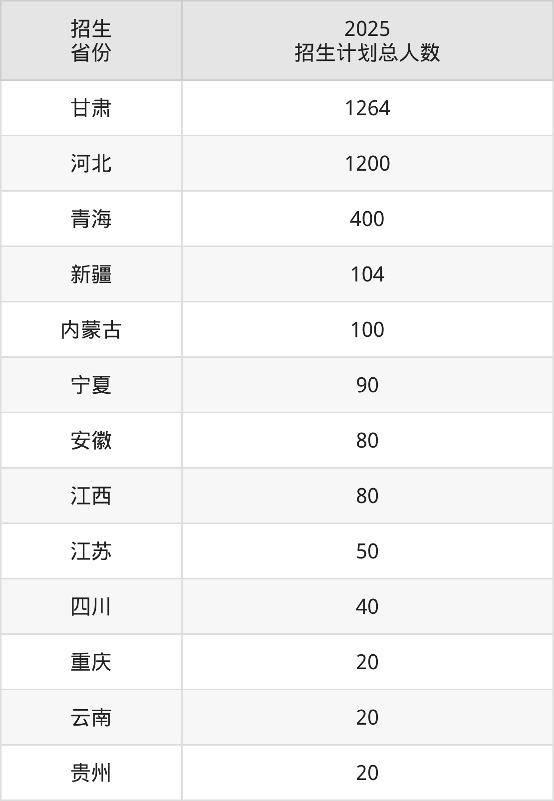 2025年兰州外语职业学院面向全国13个省市开展专科招生;招生专业共38个,招生人数共3468人。2025年在甘肃省招生计划总人数是1264人,其中,兰州外语职业学院在甘肃省招生人数最多的是口腔医学技术。兰州外语职业学院在各省具体招生人数情况如下表。