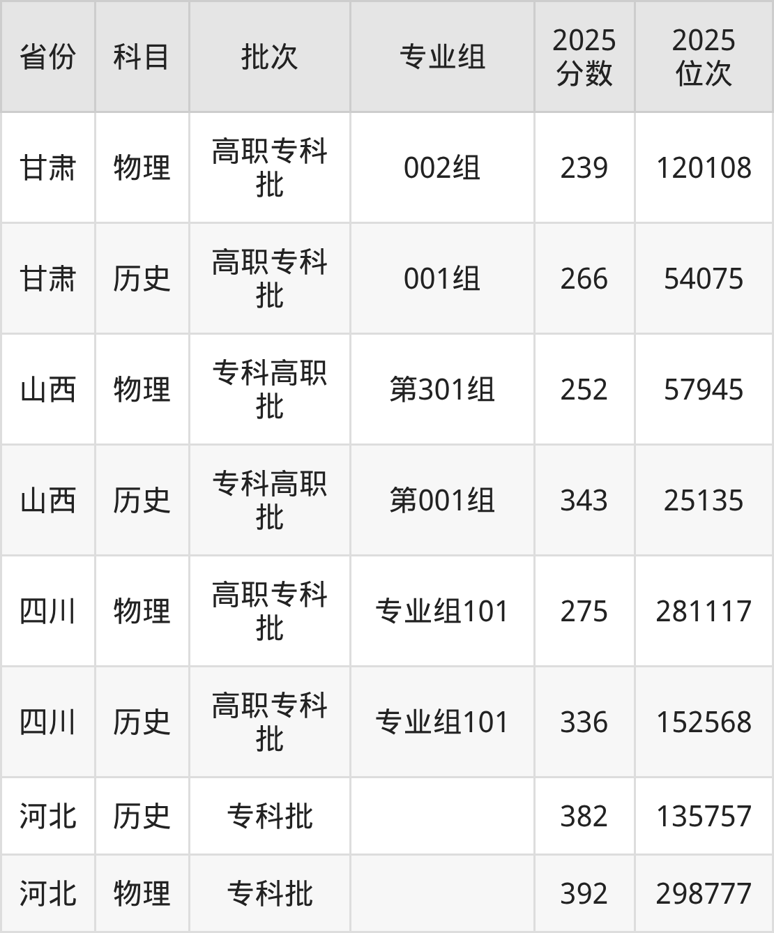 普通类专科物理类最低252分,专科历史类最低343分