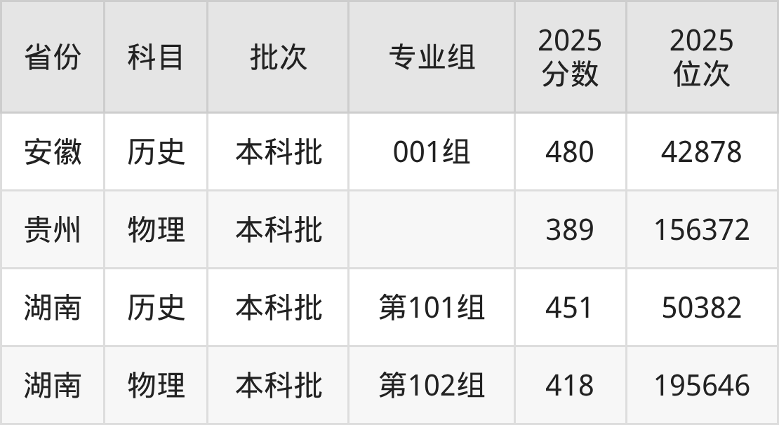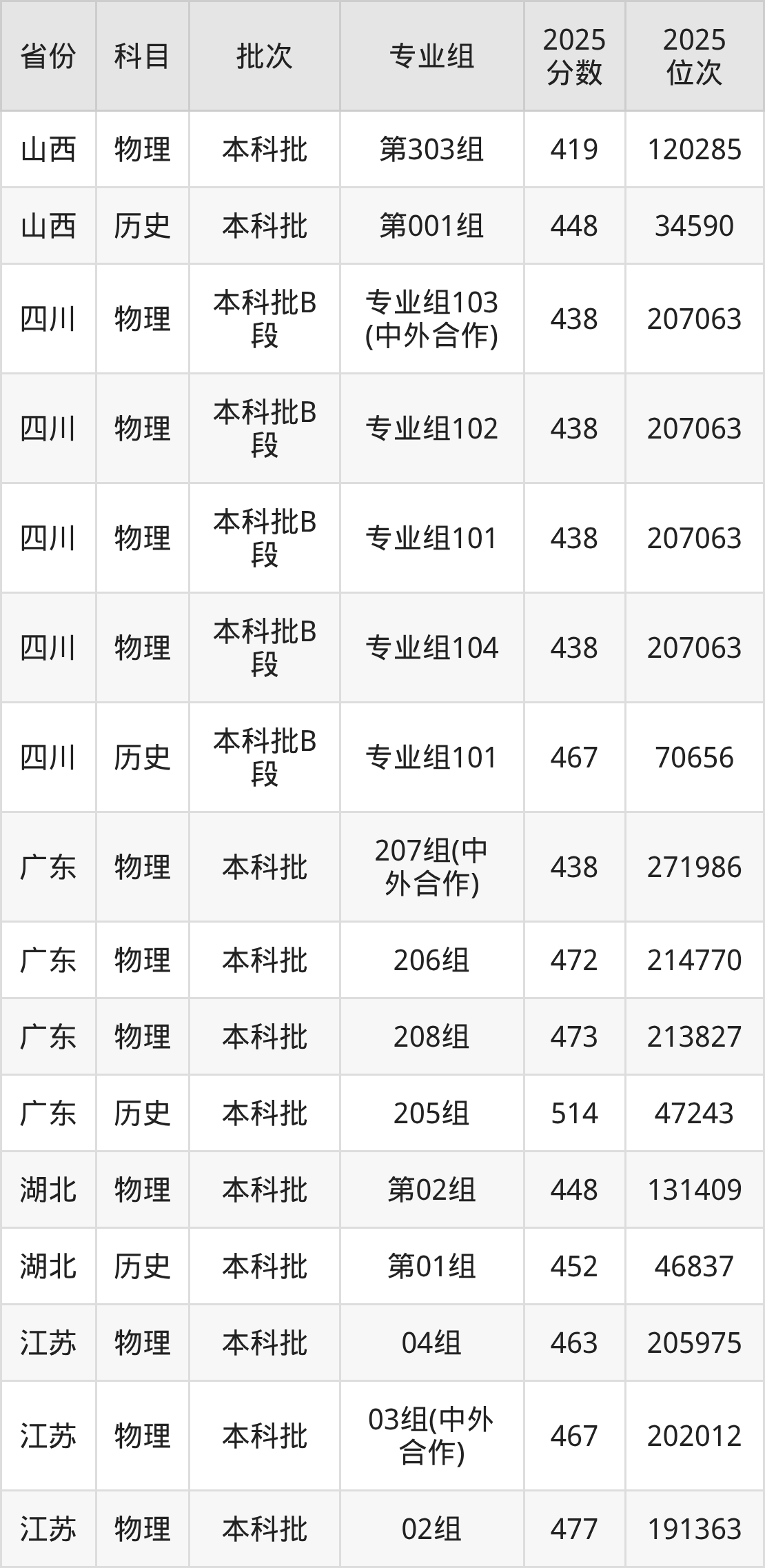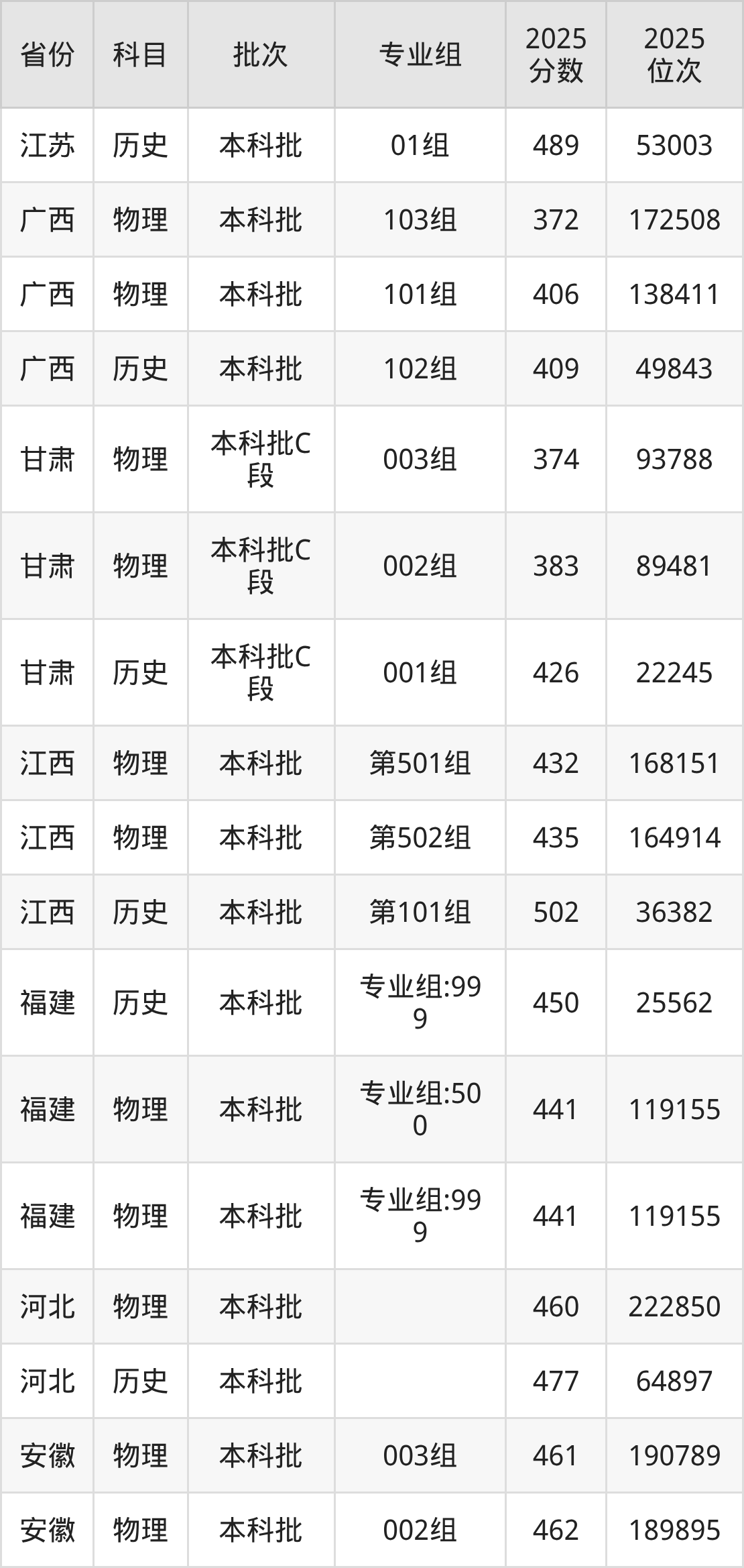 2025年在本科物理类进行招生,各专业组分数线详情如下: