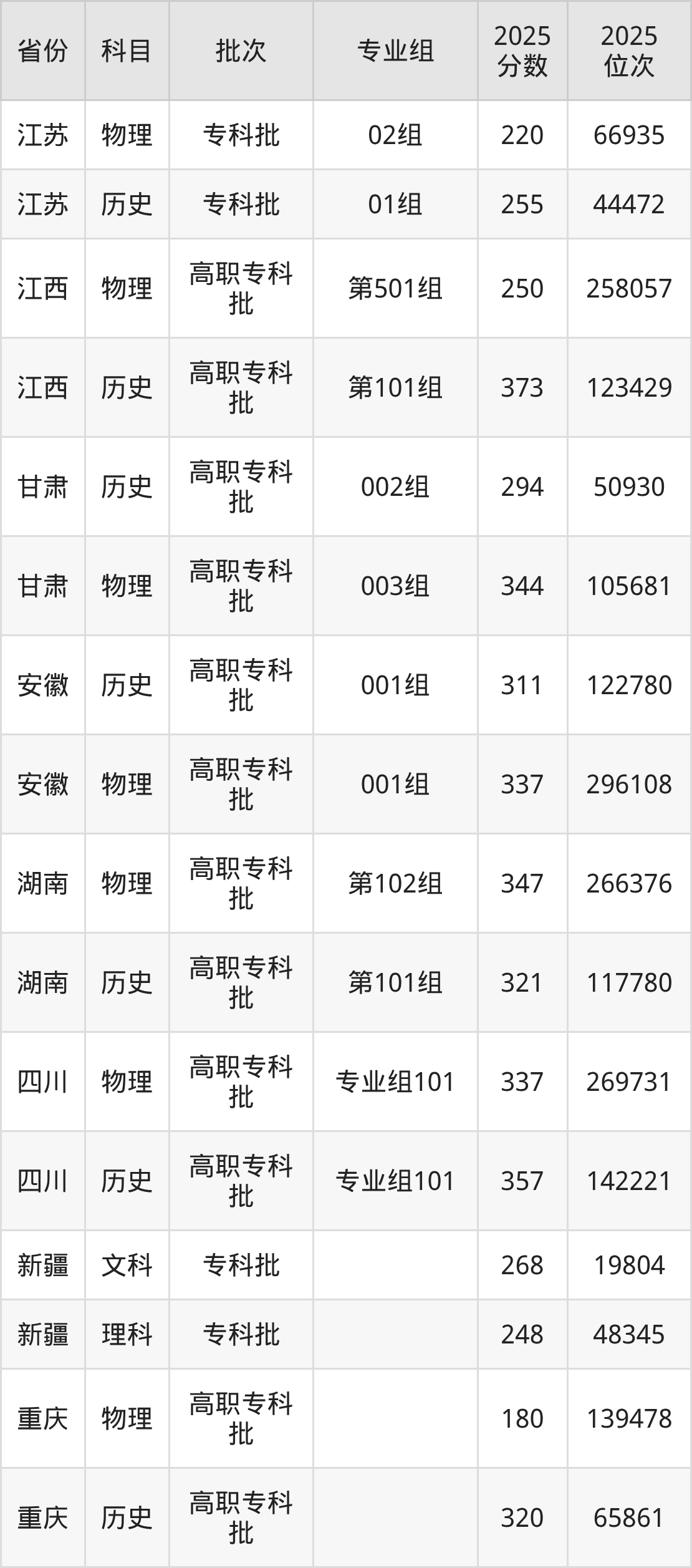 2025年塔里木职业技术学院全国录取分数线是180分到467分,录取最低在重庆物理类、录取最高在河北历史类。各省各专业组最低分具有差异,详情如下: