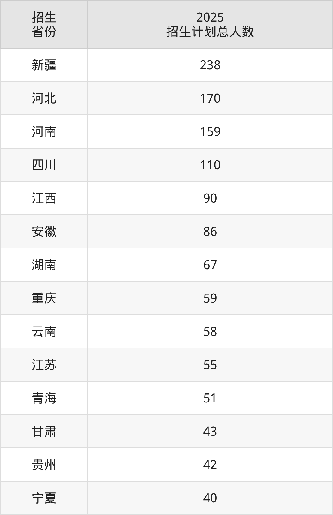 2025年塔里木职业技术学院面向全国14个省市开展专科招生;招生专业共26个,招生人数共1268人。2025年在新疆维吾尔自治区招生计划总人数是238人,其中,塔里木职业技术学院在新疆维吾尔自治区招生人数最多的是酒店管理与数字化运营。塔里木职业技术学院在各省具体招生人数情况如下表。
