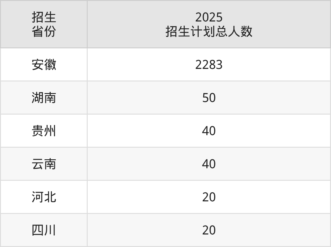 2025年宿州职业技术学院面向全国6个省市开展专科招生;招生专业共36个,招生人数共2453人。2025年在安徽省招生计划总人数是2283人,其中,宿州职业技术学院在安徽省招生人数最多的是机电一体化技术。宿州职业技术学院在各省具体招生人数情况如下表。