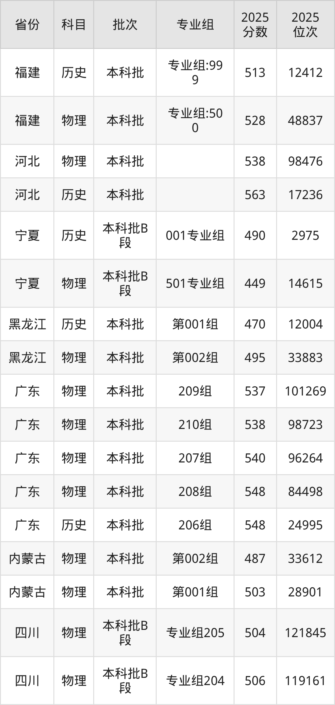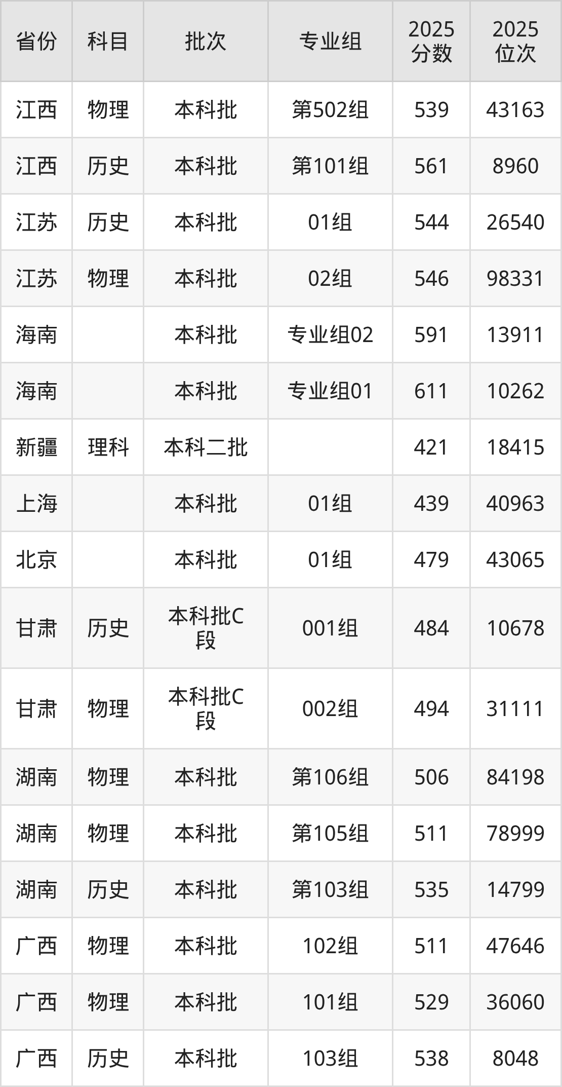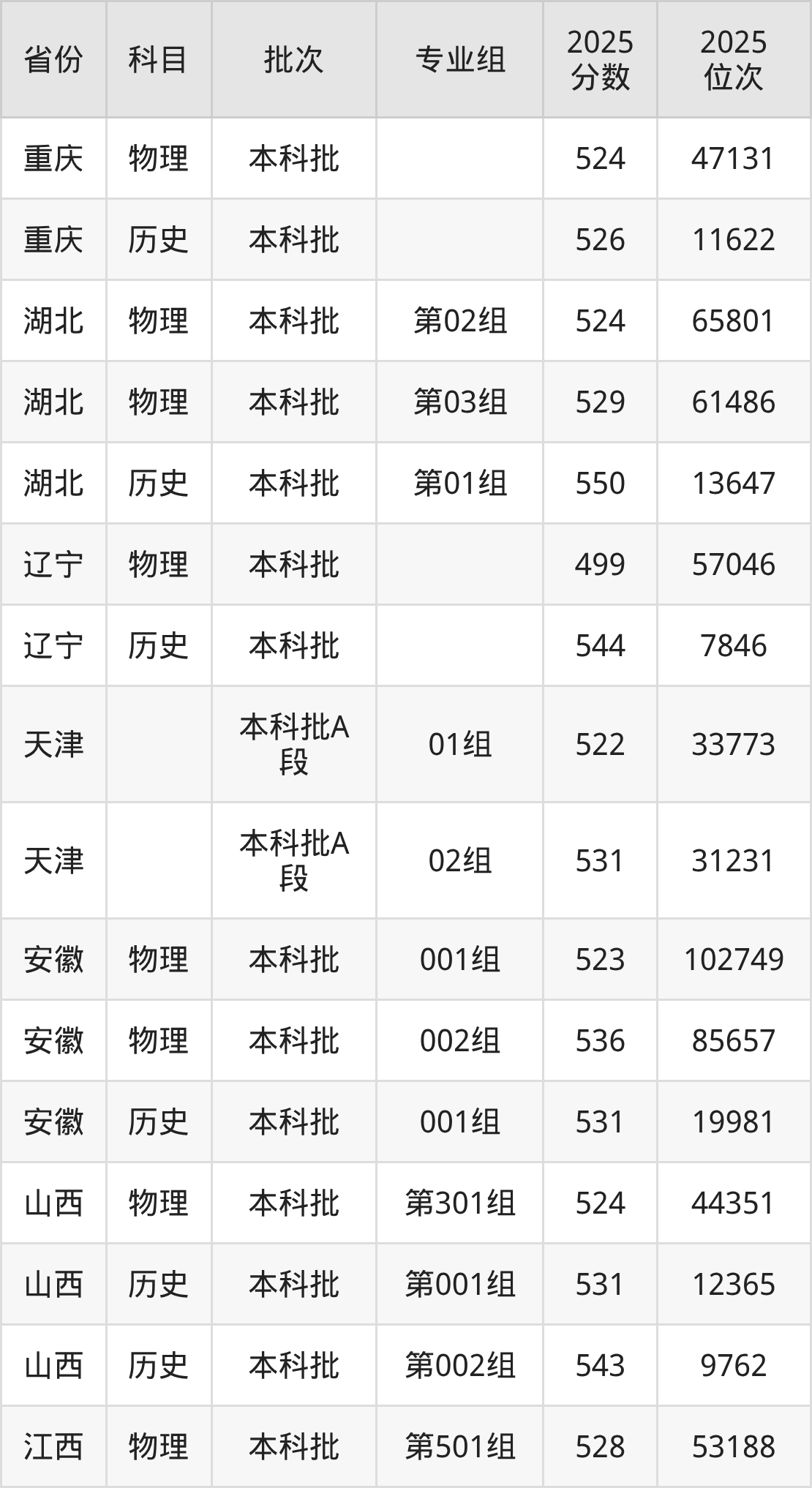 2025年在本科物理类进行招生,各专业组分数线详情如下: