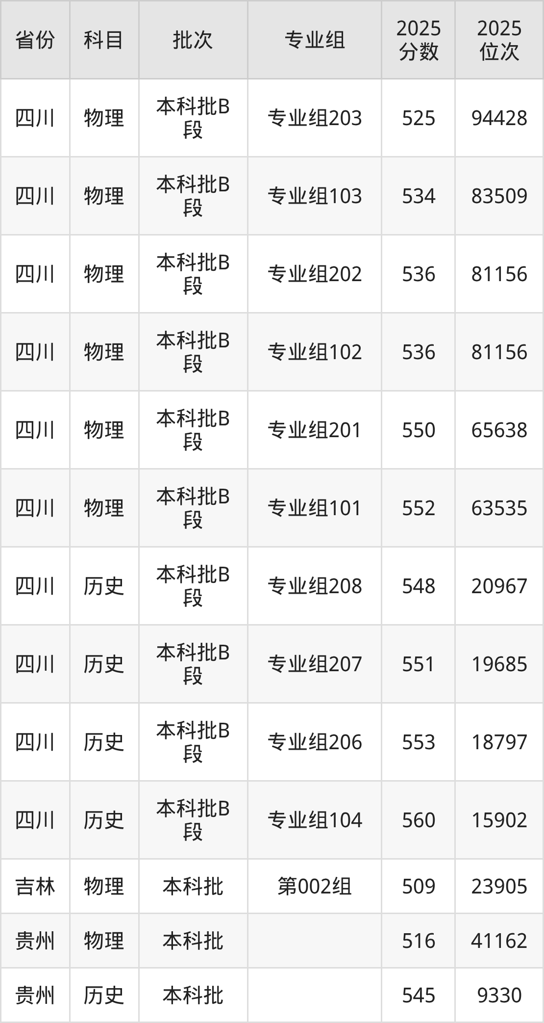 四川轻化工大学专业组201:2025年投档录取最低分为550分,录取最低位次为65638名。