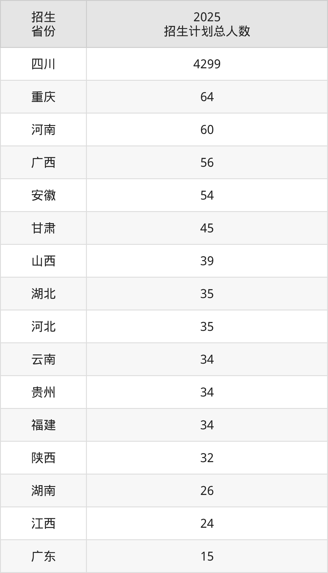 2025年四川轻化工大学面向全国28个省市开展本科招生;招生专业共67个,招生人数共4987人。2025年在四川省招生计划总人数是4299人,其中,四川轻化工大学在四川省招生人数最多的是材料科学与工程。四川轻化工大学在各省具体招生人数情况如下表。