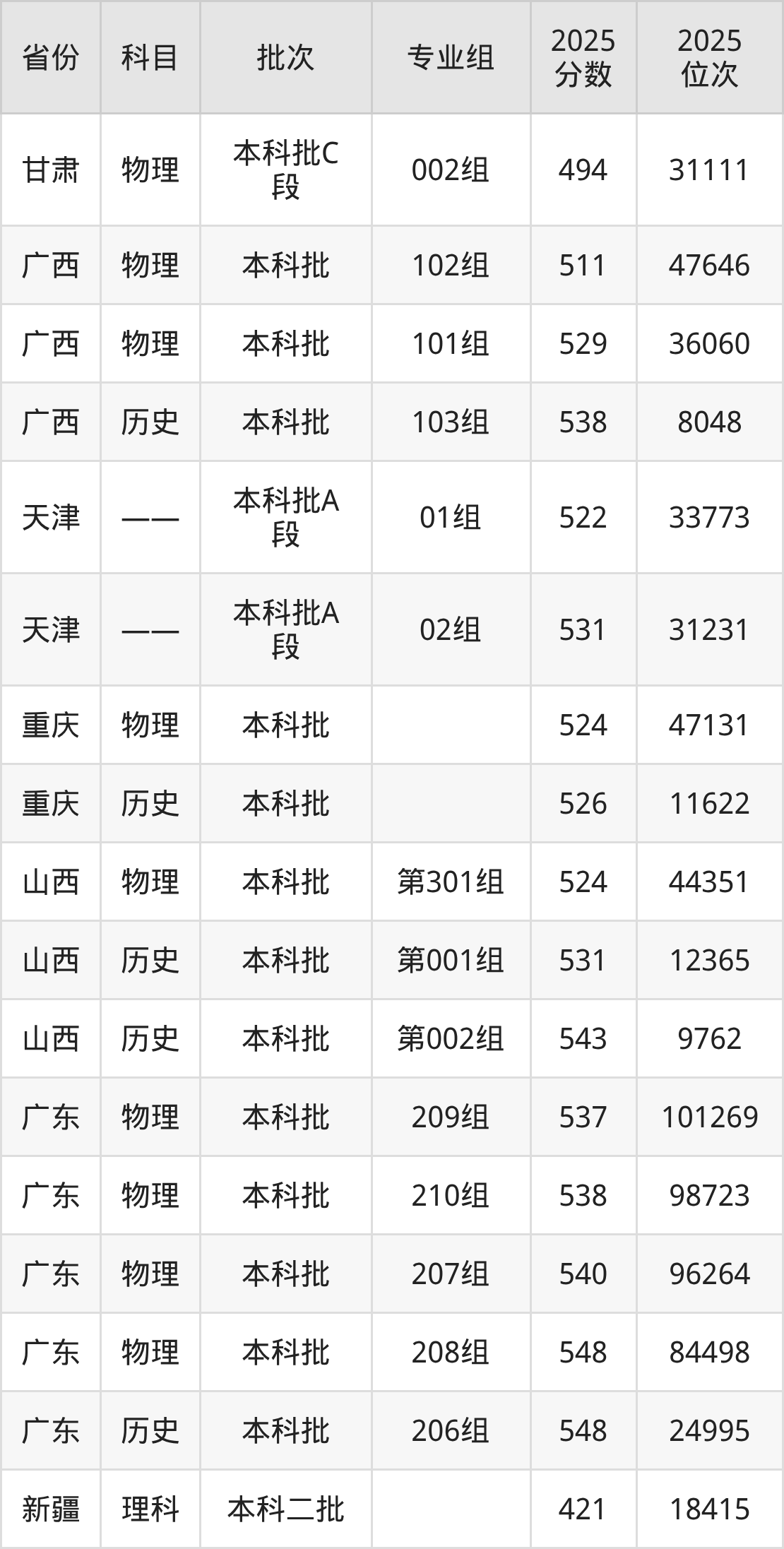 普通类本科物理类最低524分,本科历史类最低531分