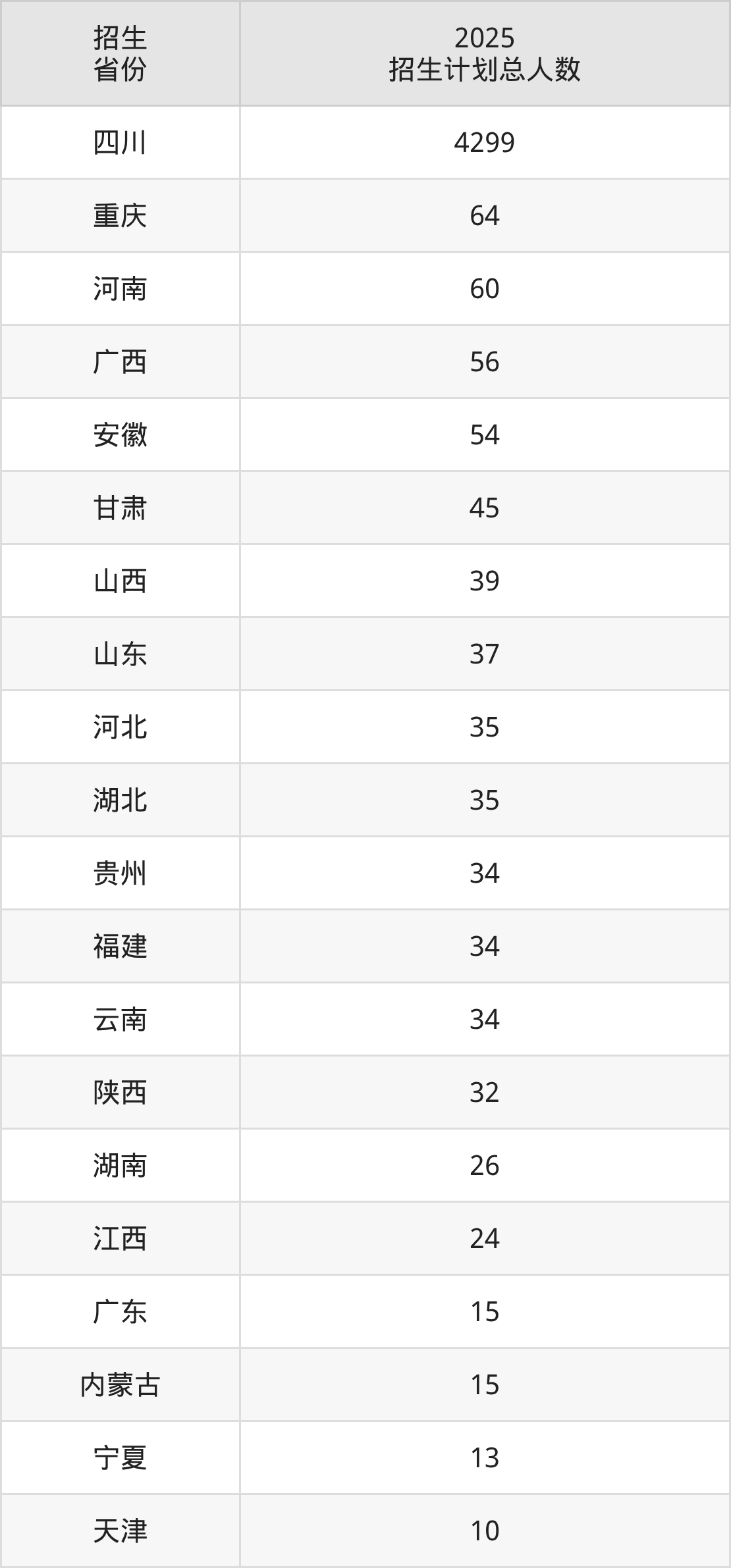 2025年四川轻化工大学面向全国29个省市开展本科招生;招生专业共67个,招生人数共5024人。2025年在四川省招生计划总人数是4299人,其中,四川轻化工大学在四川省招生人数最多的是材料科学与工程。四川轻化工大学在各省具体招生人数情况如下表。