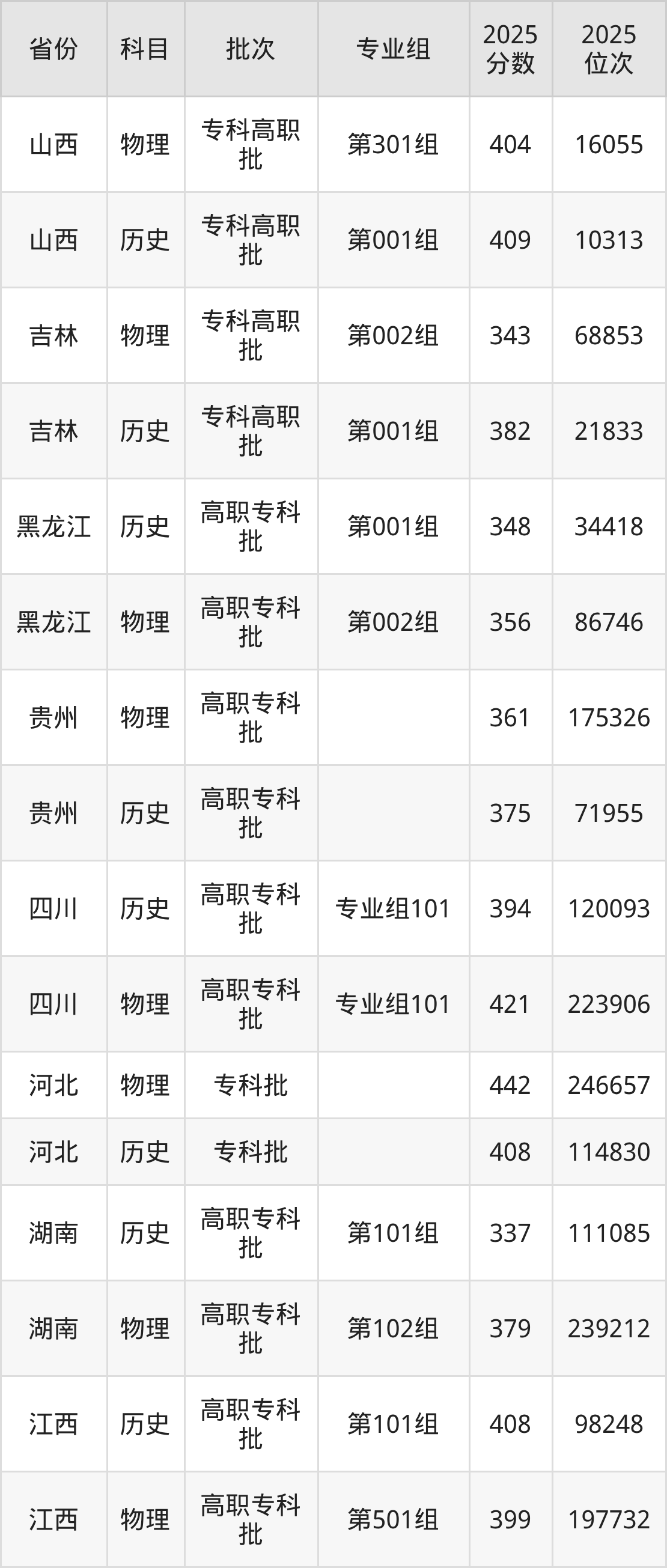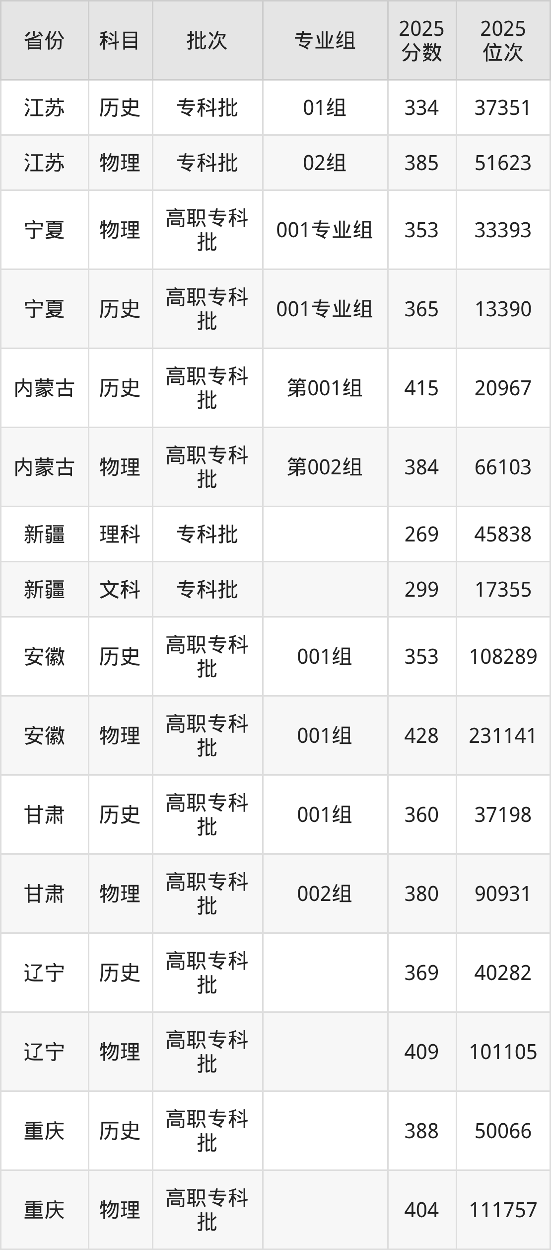 普通类专科物理类最低343分,专科历史类最低382分