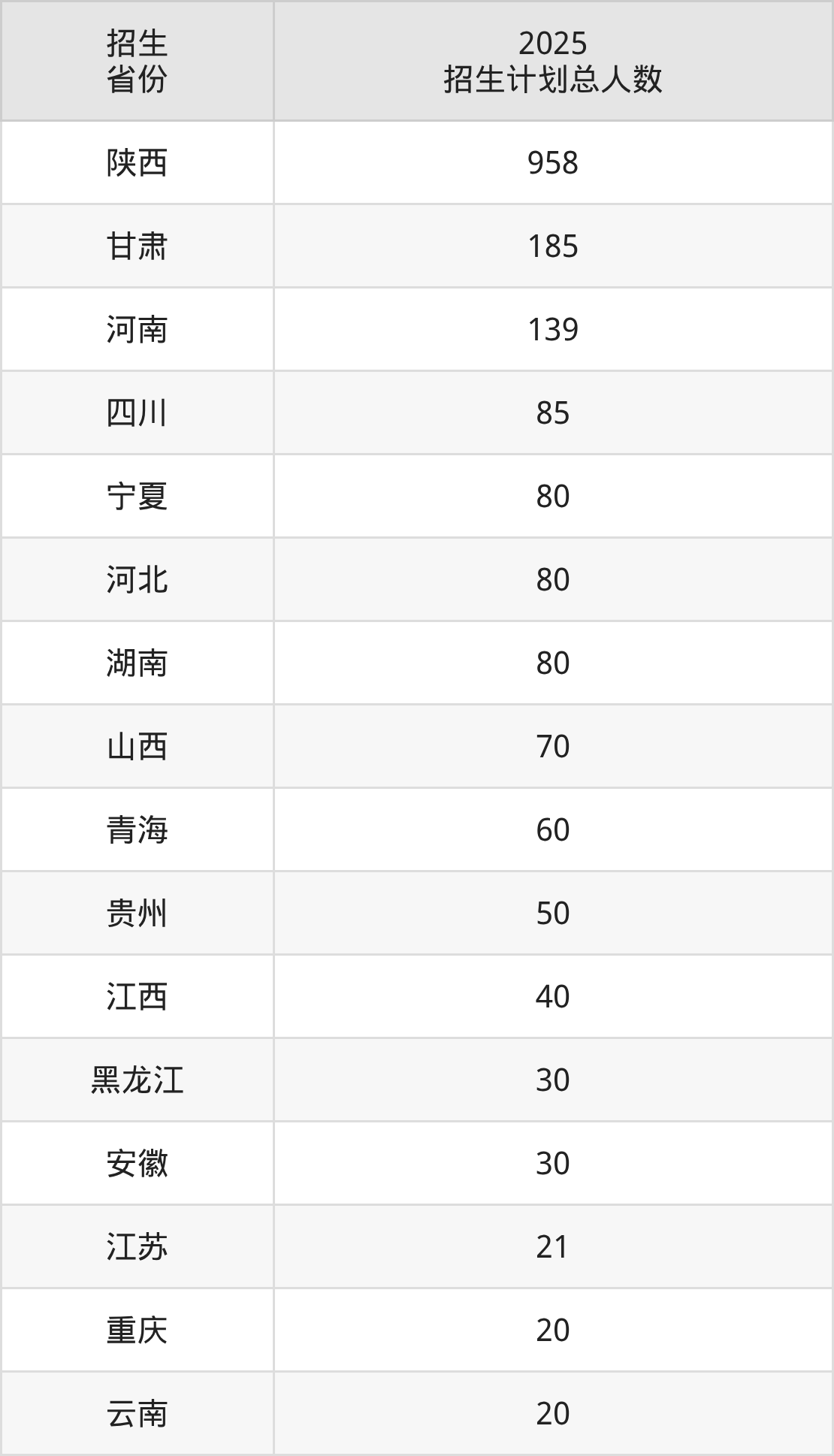 2025年陕西航空职业技术学院面向全国20个省市开展专科招生;招生专业共36个,招生人数共2019人。2025年在陕西省招生计划总人数是958人,其中,陕西航空职业技术学院在陕西省招生人数最多的是机械设计与制造。陕西航空职业技术学院在各省具体招生人数情况如下表。