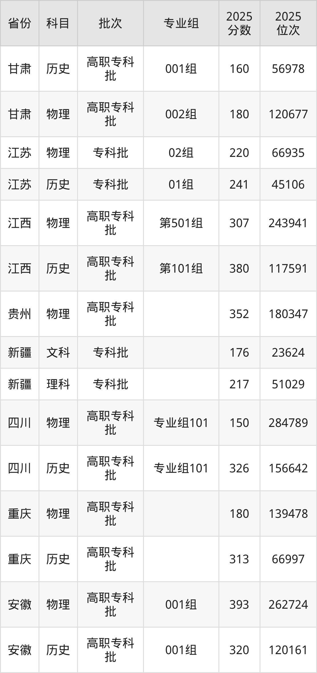 2025年在专科物理类进行招生,各专业组分数线详情如下: