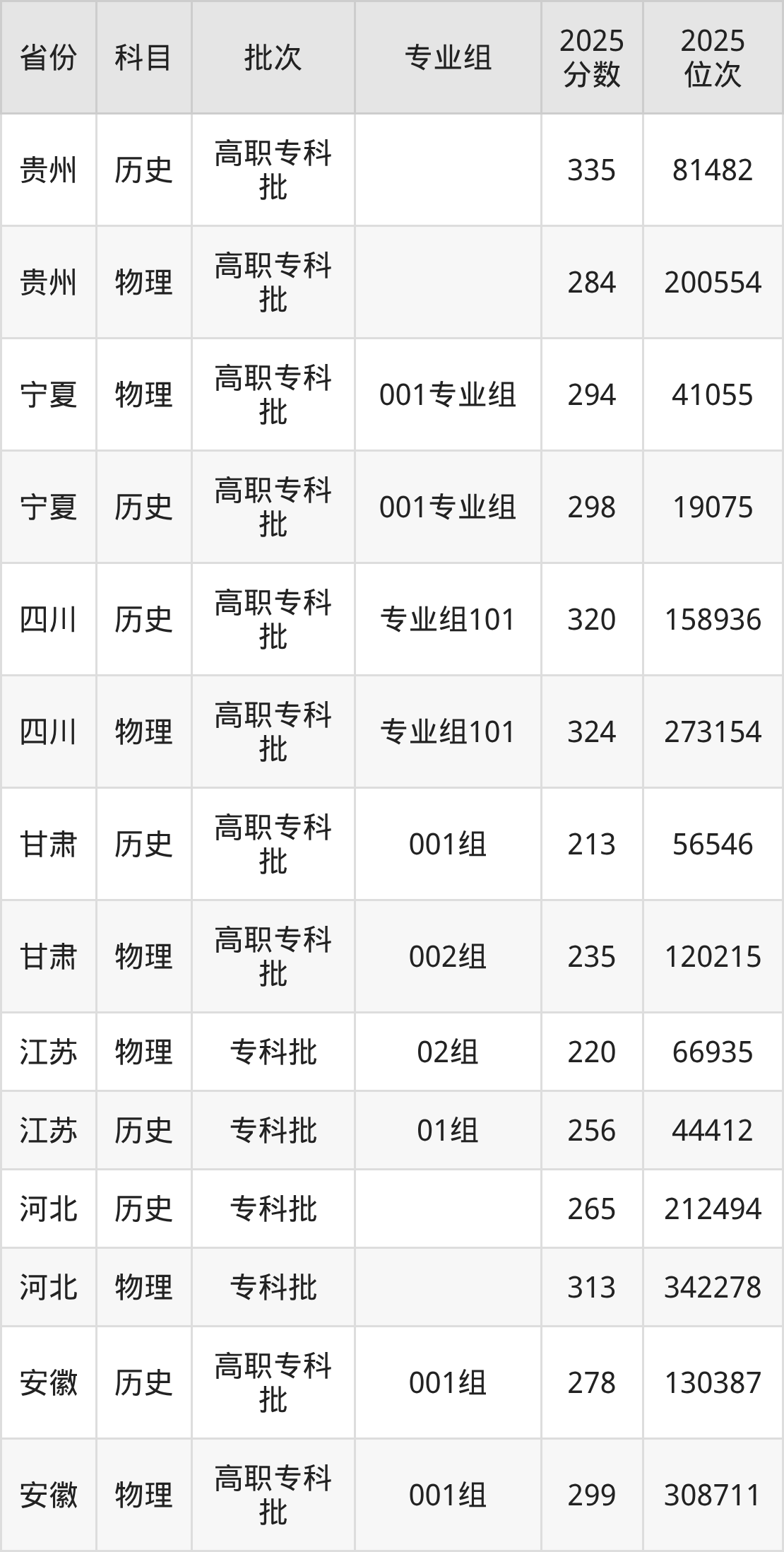 2025年陕西电子信息职业技术学院全国录取分数线是213分到452分,录取最低在甘肃历史类(001组)、录取最高在河北历史类。各省各专业组最低分具有差异,详情如下: