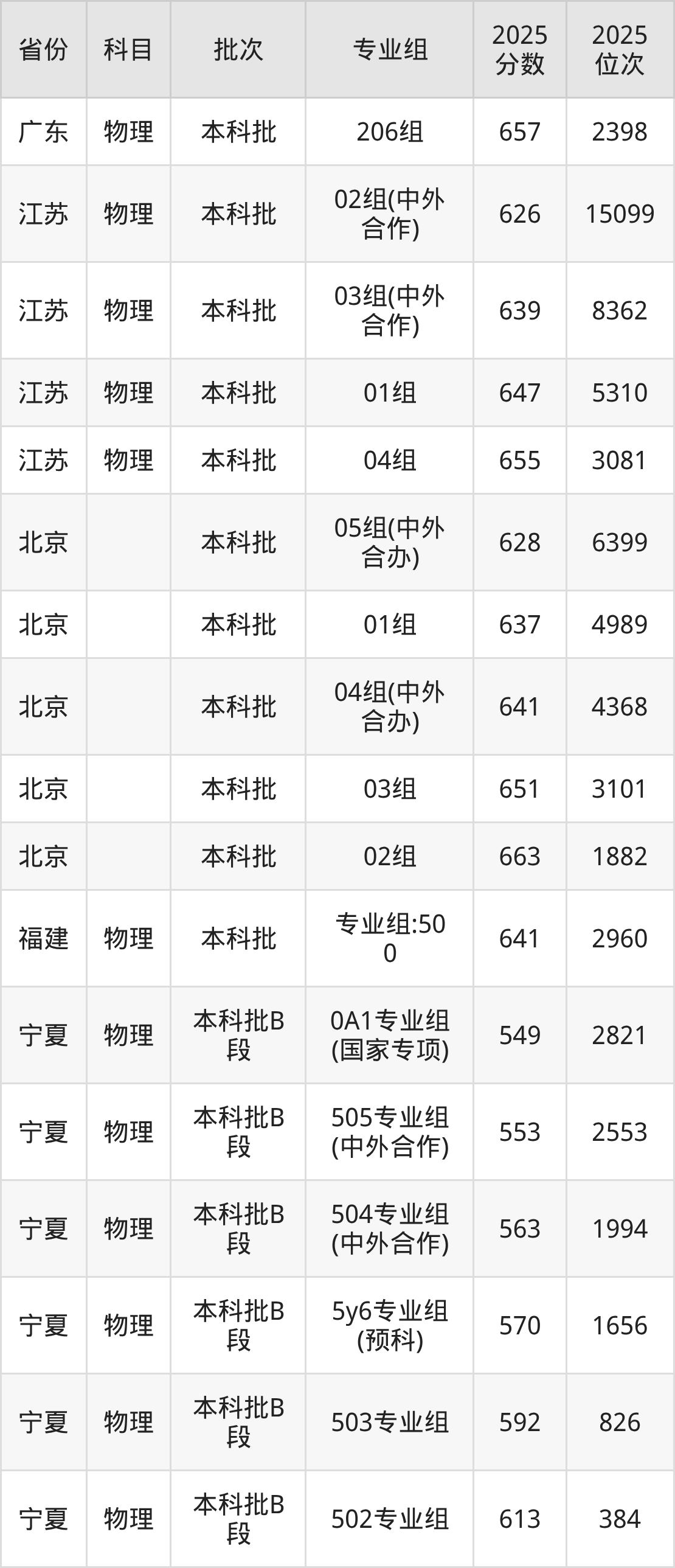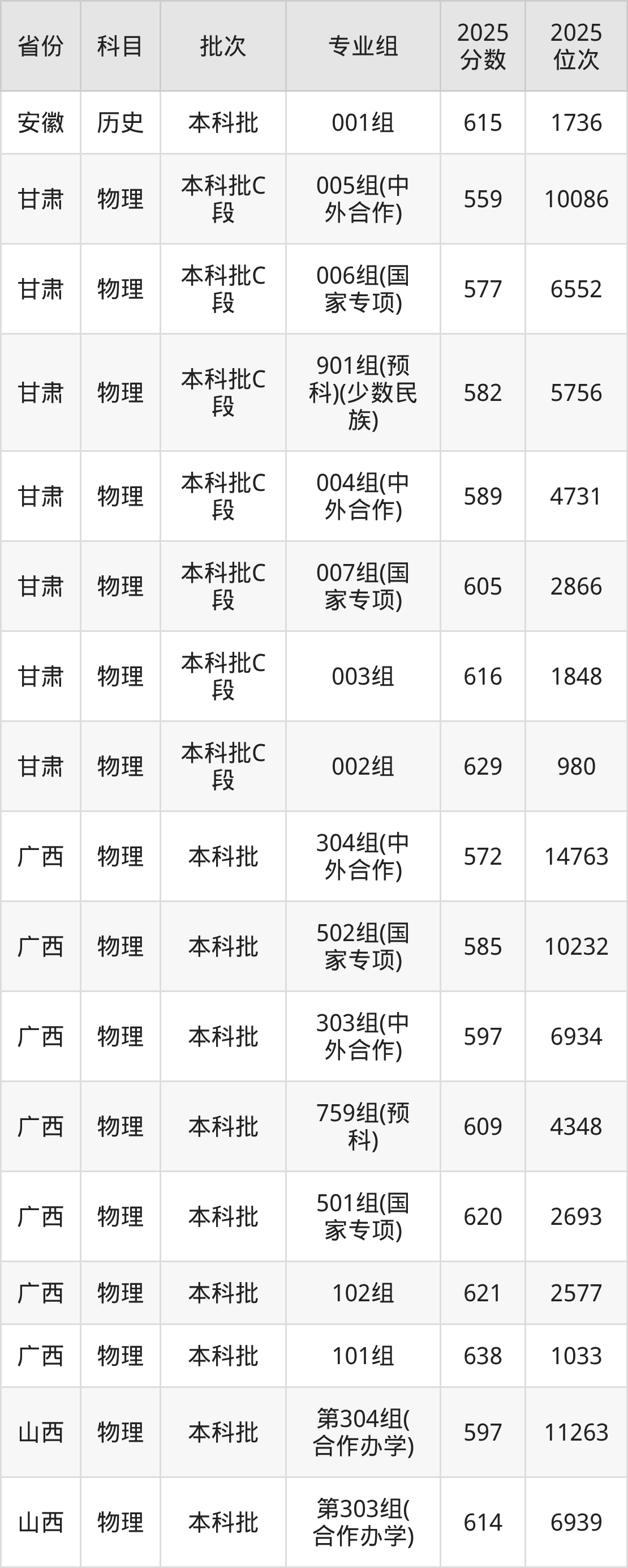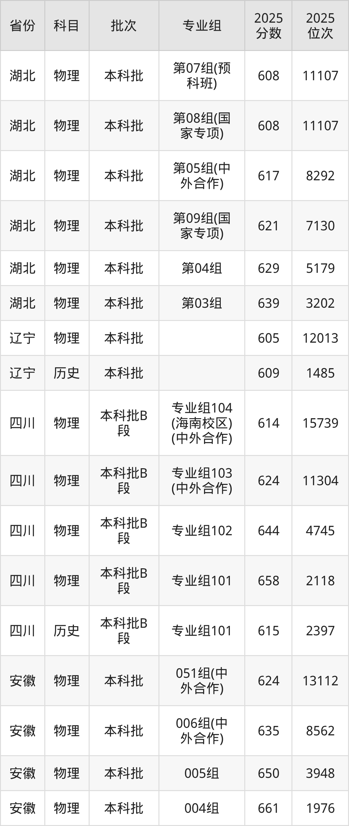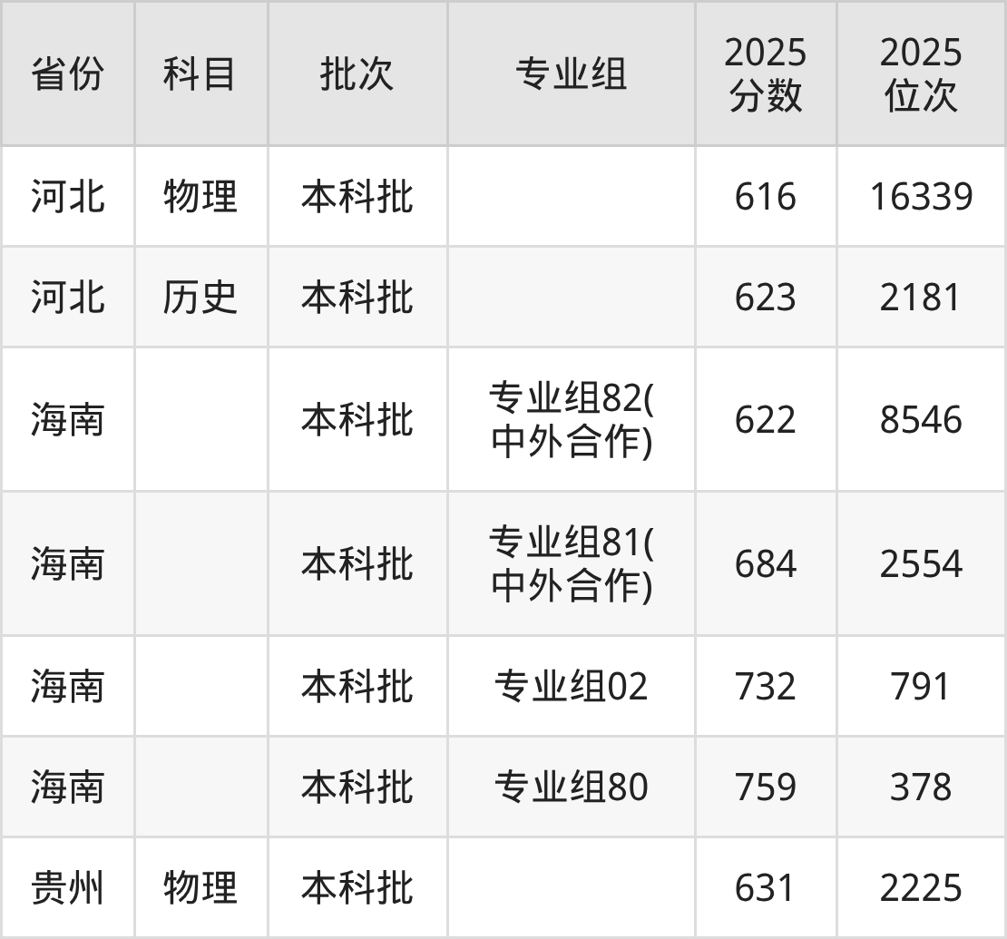 2025年在本科物理类进行招生,各专业组分数线详情如下: