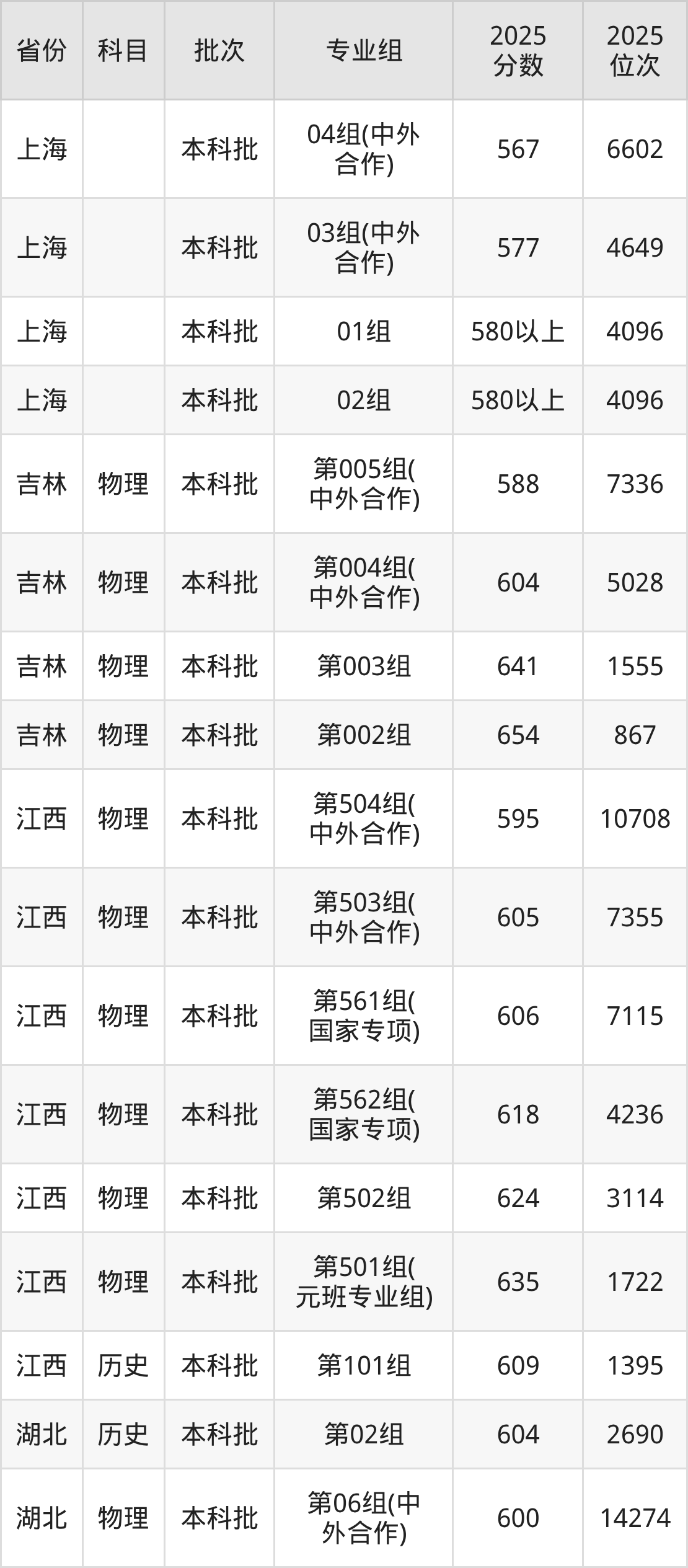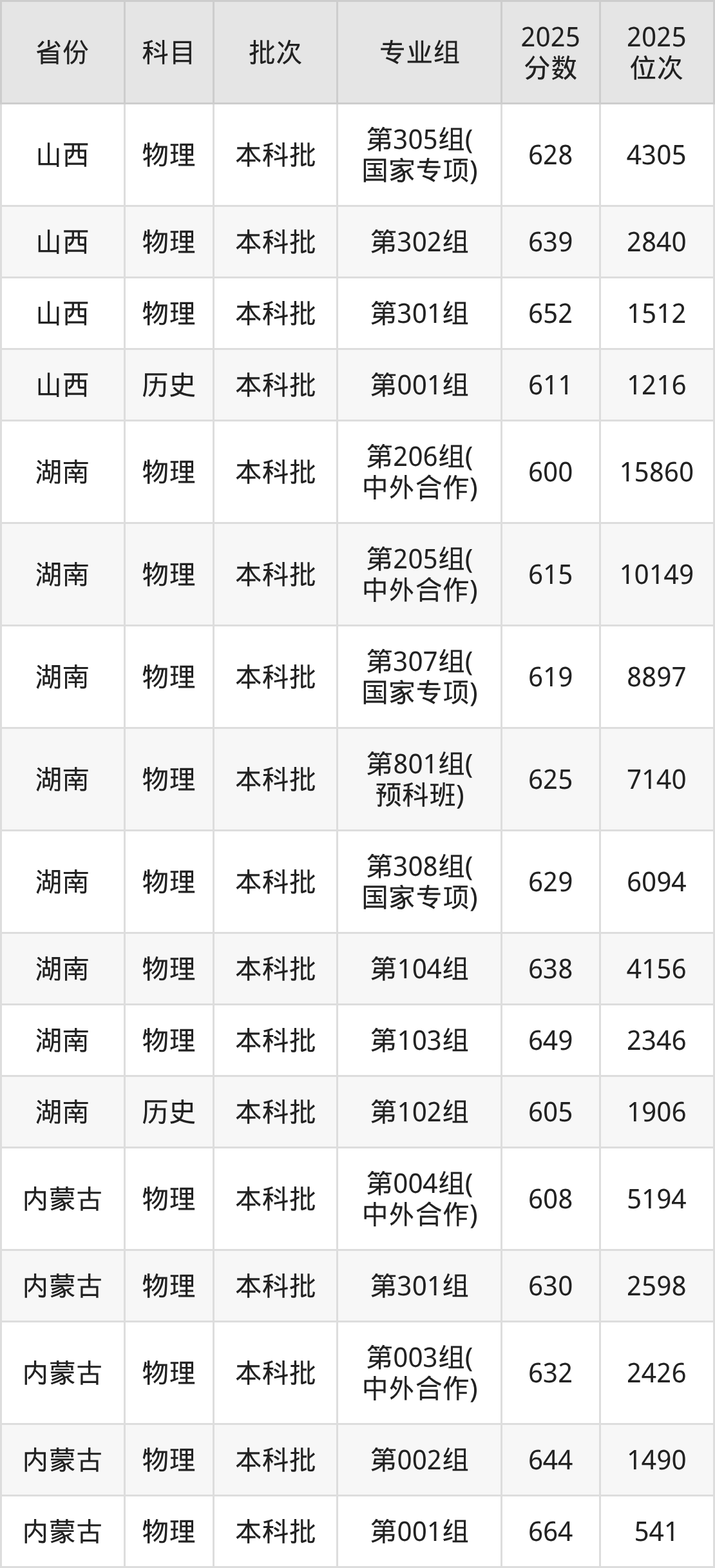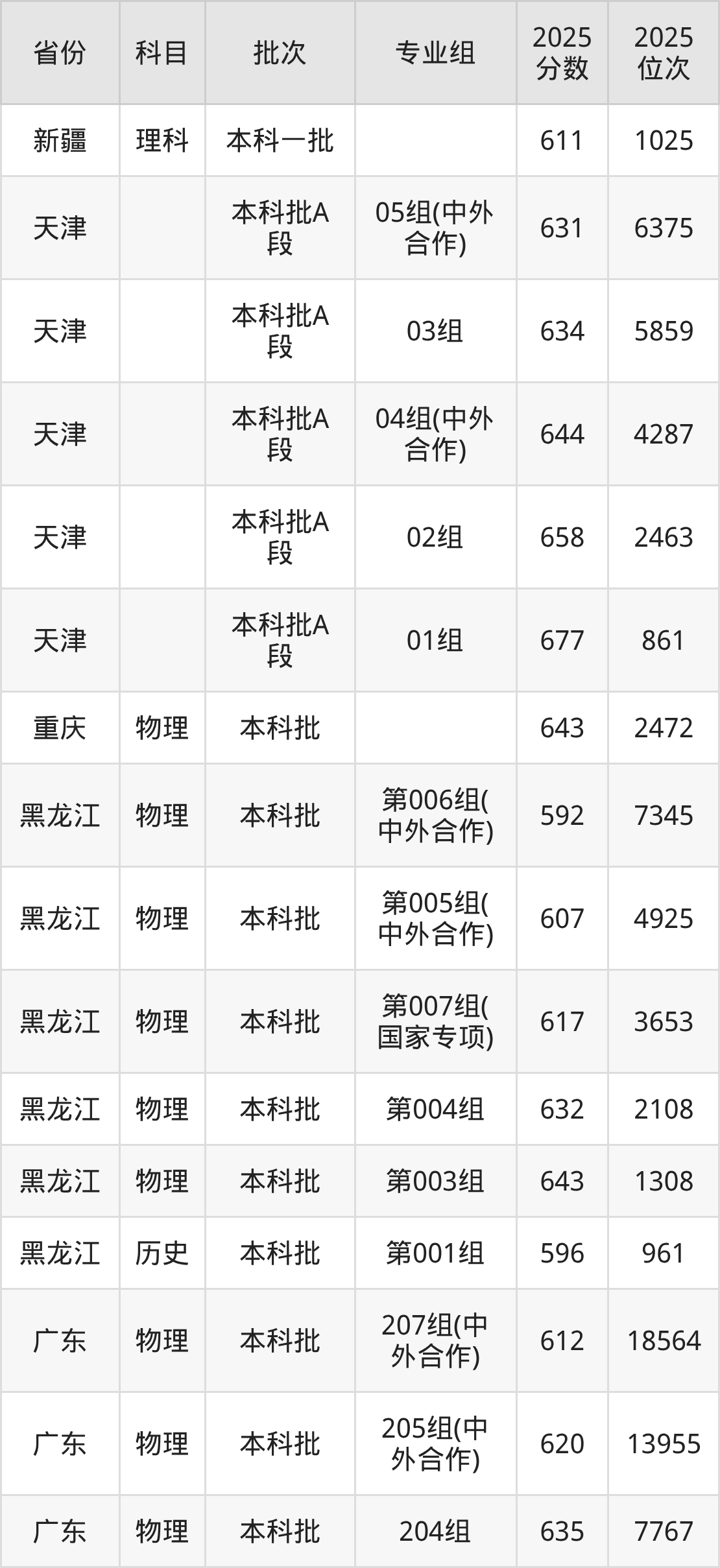 2025年在本科物理类进行招生,各专业组分数线详情如下: