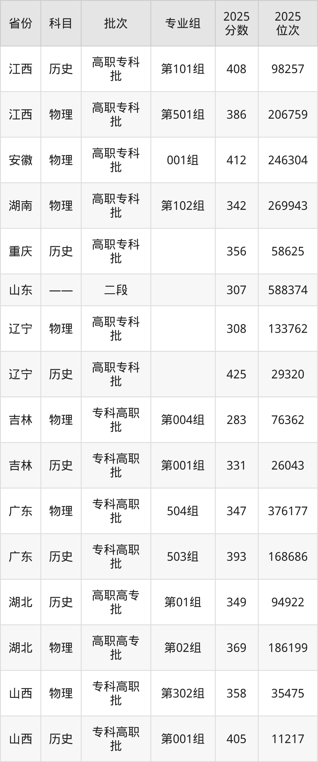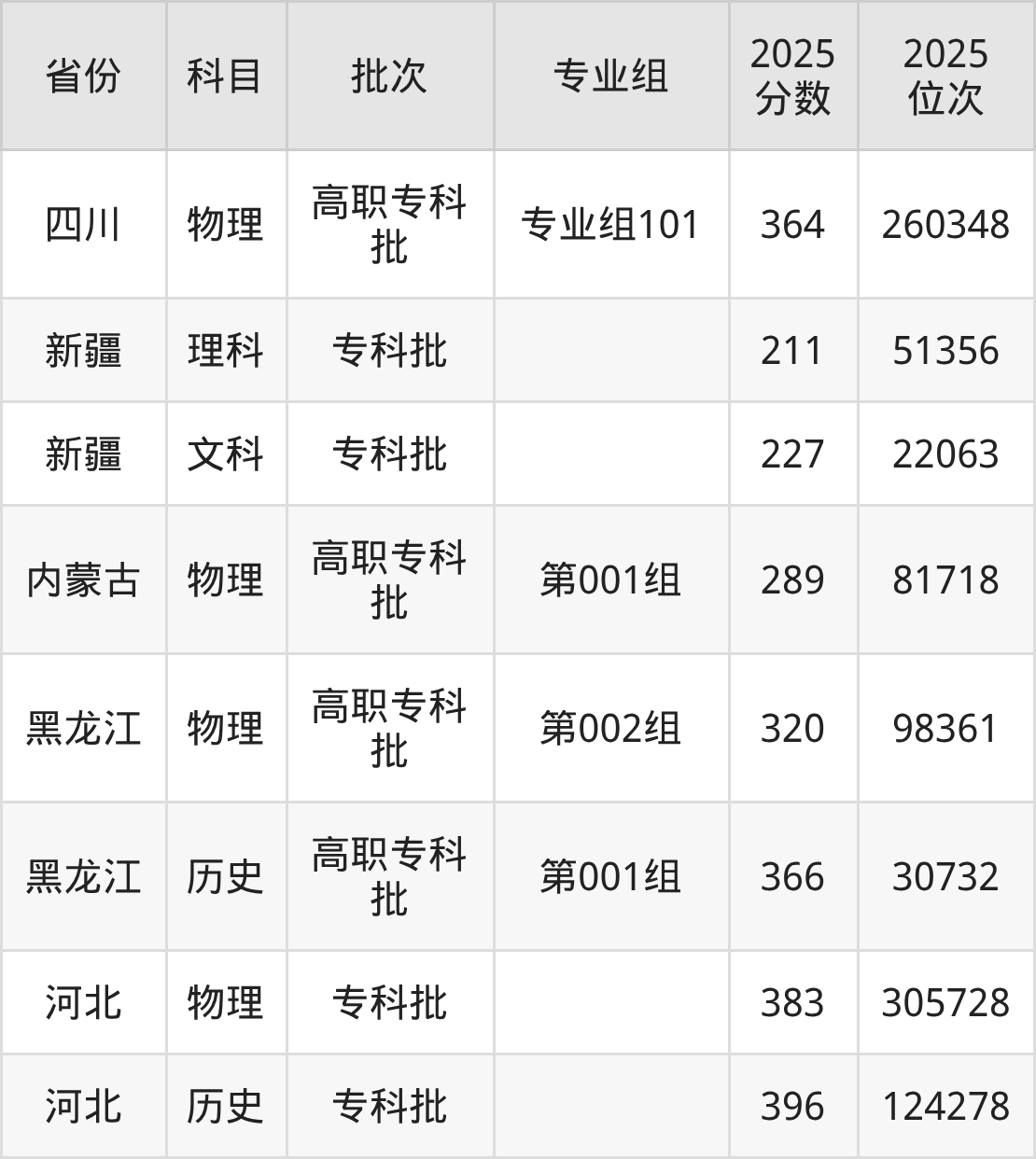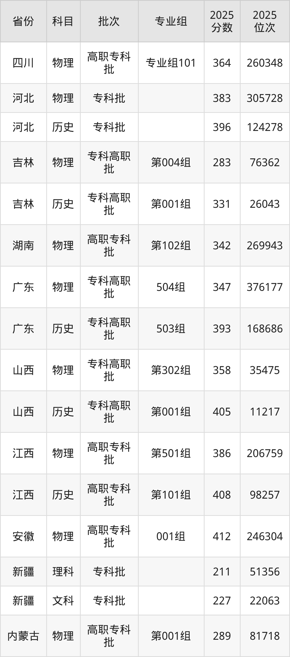 2025年在专科物理类进行招生,各专业组分数线详情如下:
