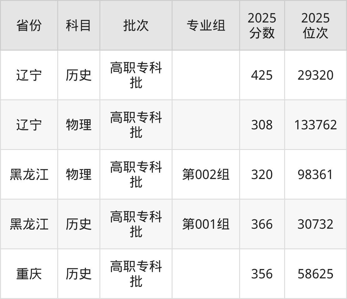 2025年在专科历史类进行招生,各专业组分数线详情如下: