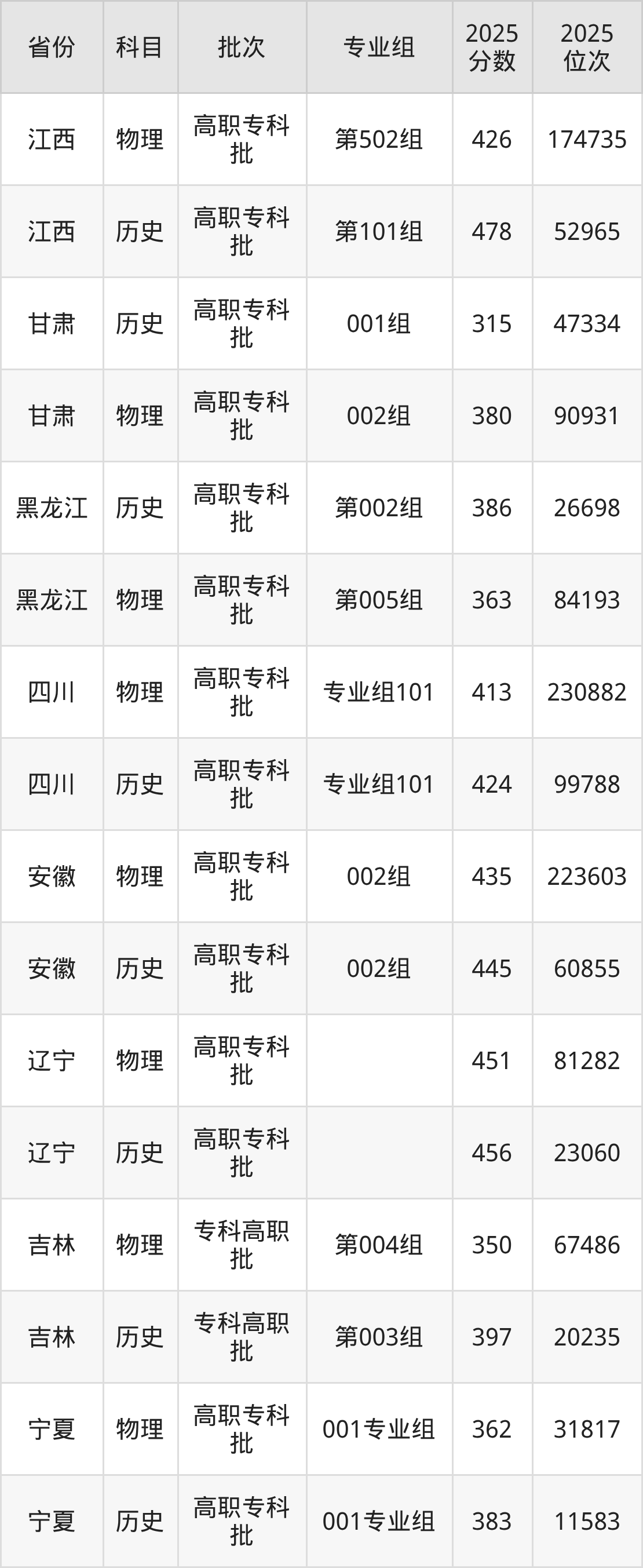 普通类专科物理类最低426分,专科历史类最低478分
