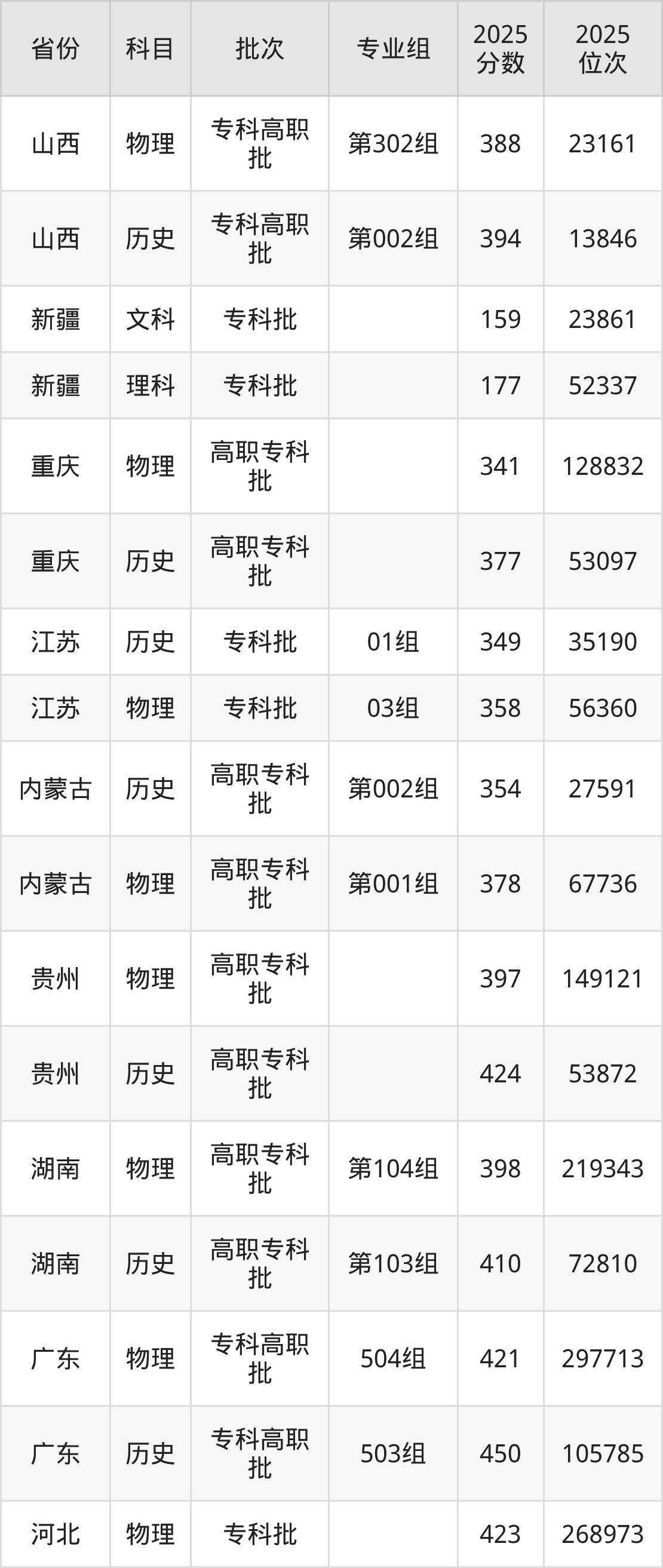 普通类专科物理类最低341分,专科历史类最低377分