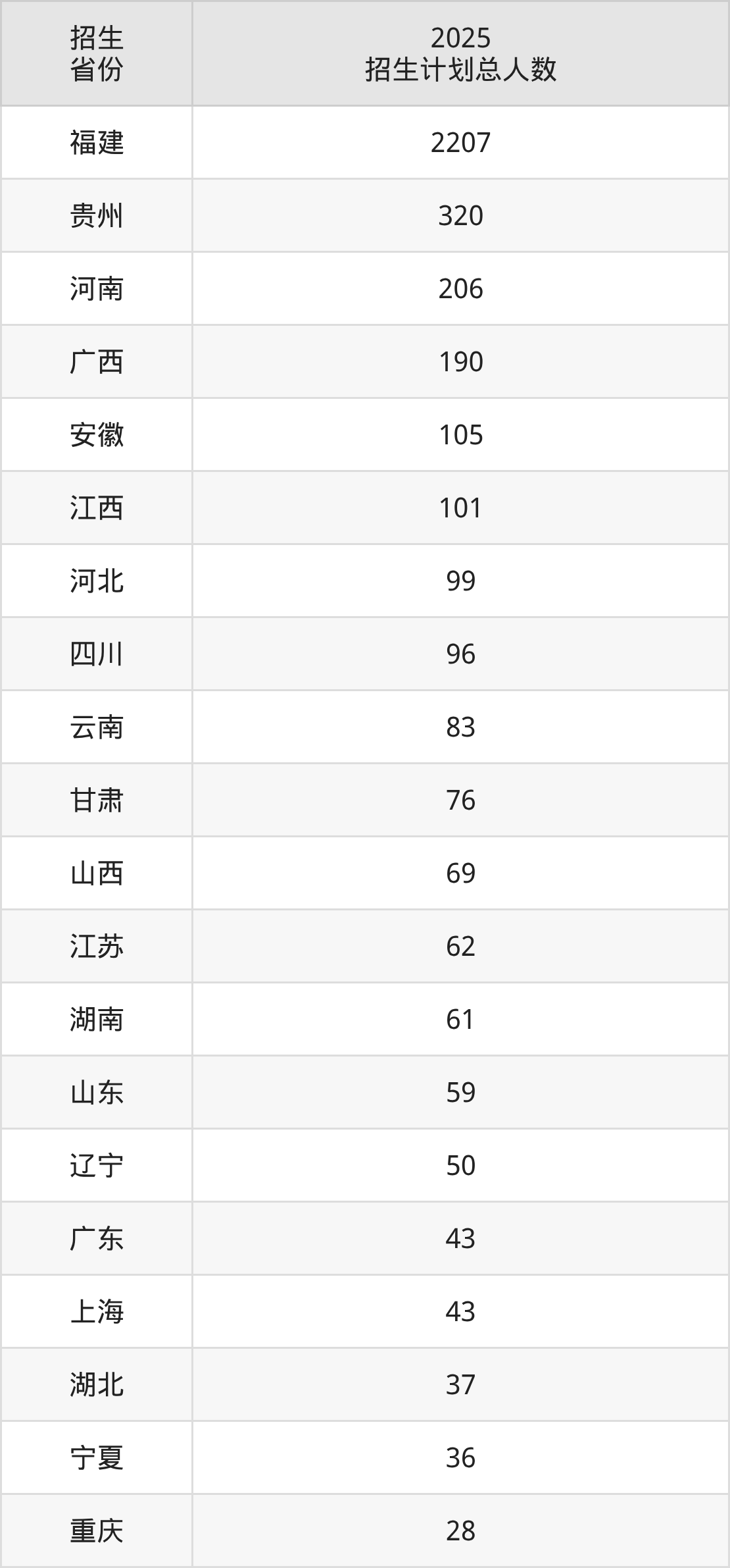 2025年集美大学面向全国29个省市开展本科招生;招生专业共56个,招生人数共4148人。2025年在福建省招生计划总人数是2207人,其中,集美大学在福建省招生人数最多的是计算机科学与技术。集美大学在各省具体招生人数情况如下表。