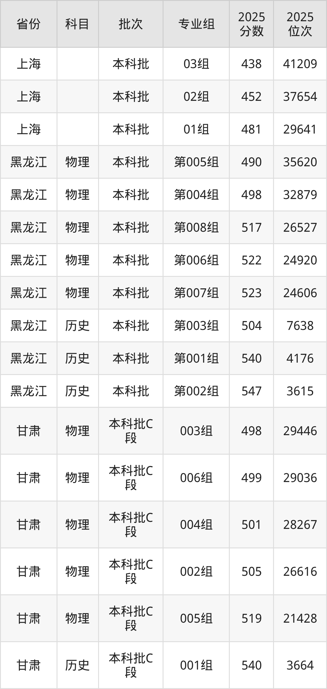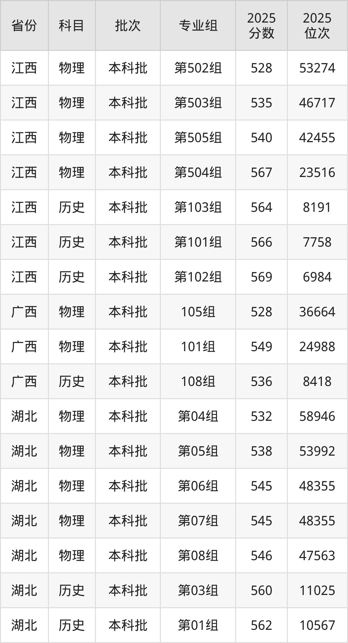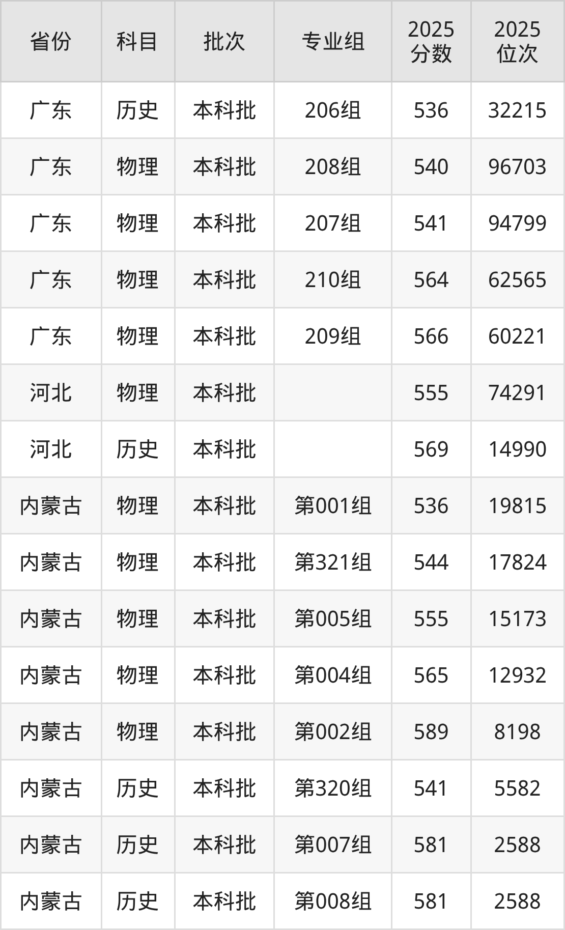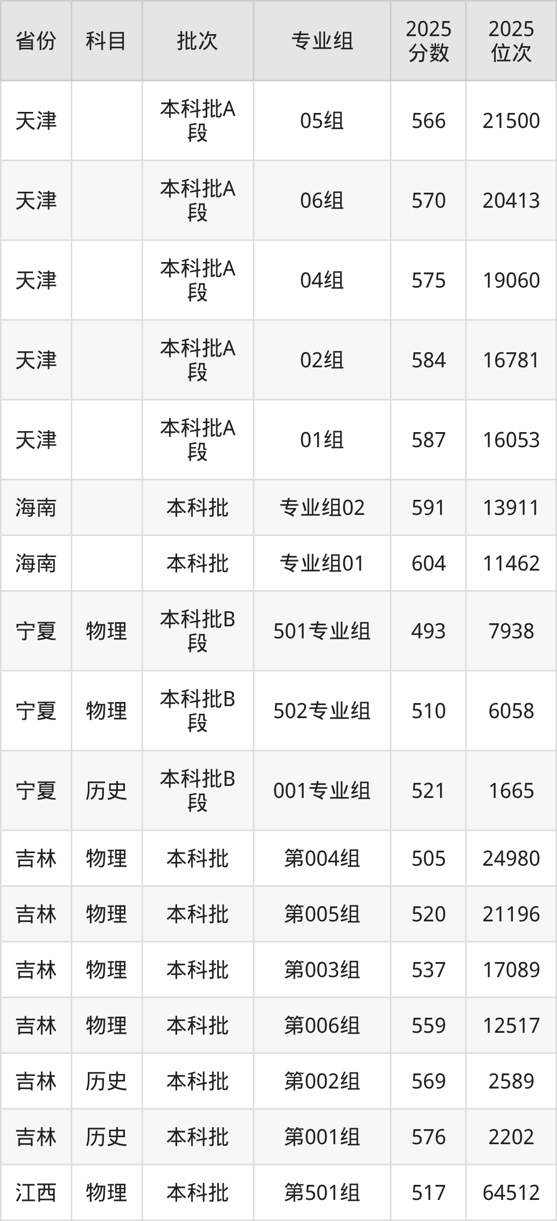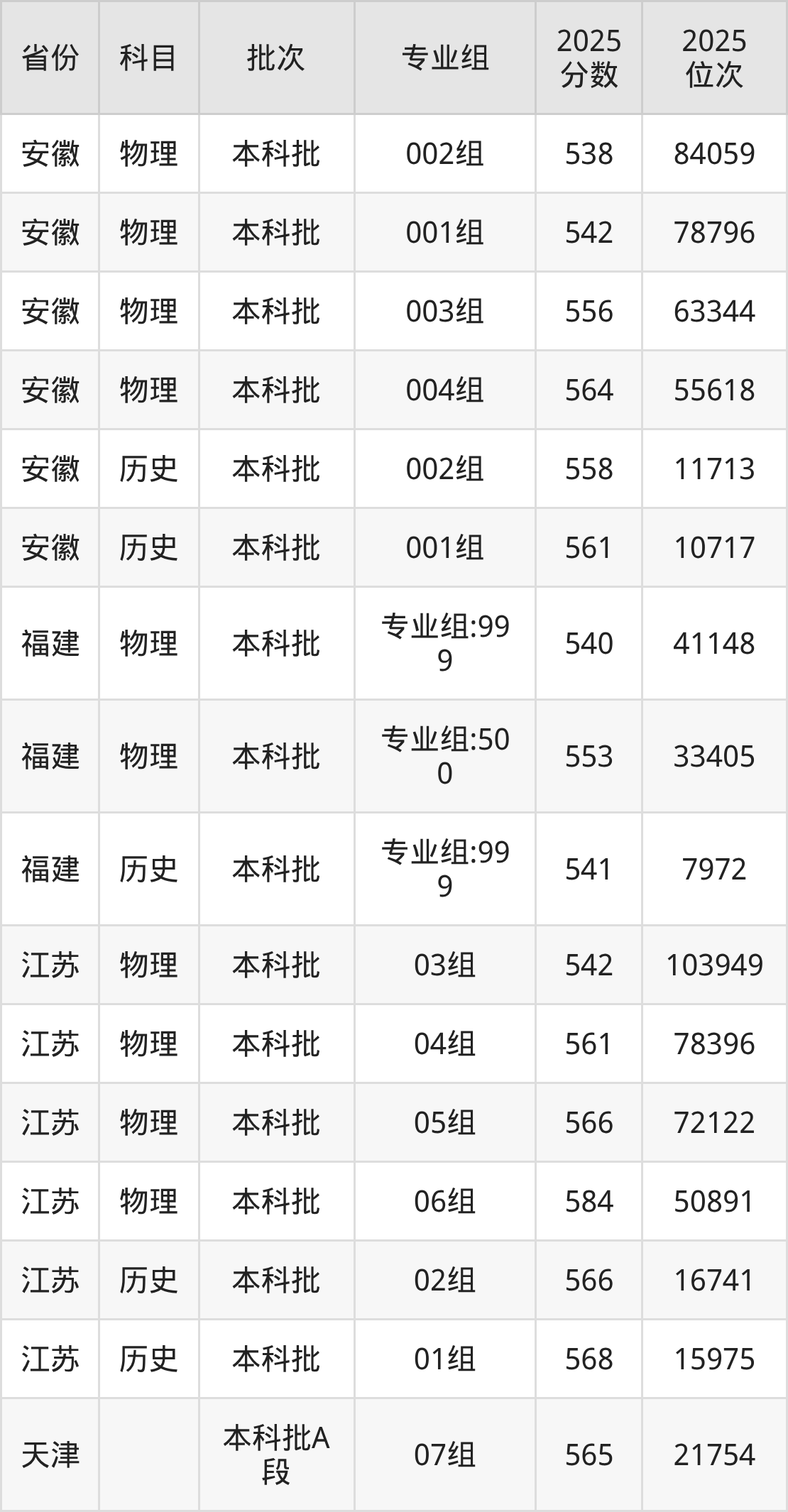 2025年在本科理科进行招生,各专业组分数线详情如下: