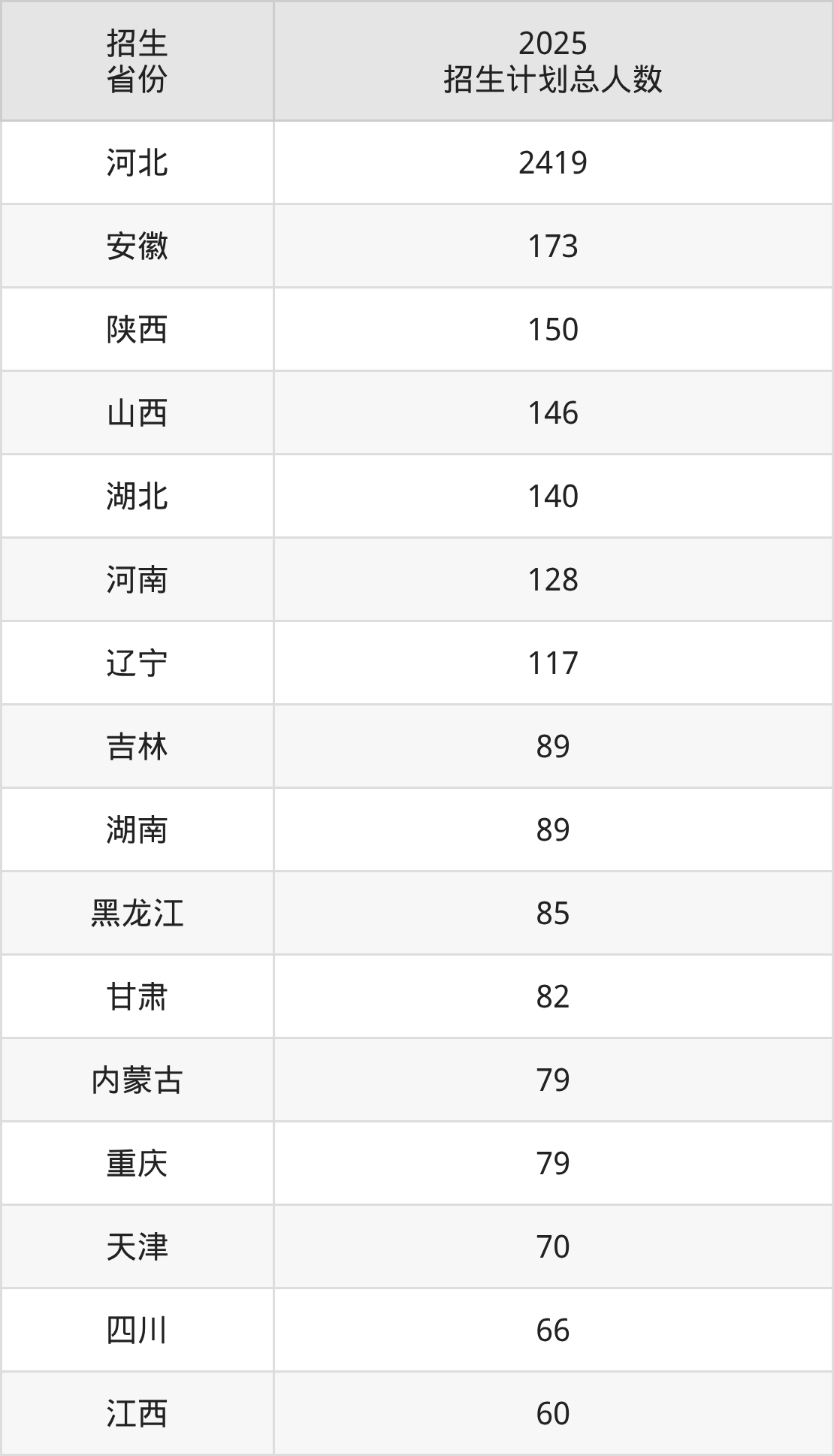 2025年石家庄铁道大学面向全国28个省市开展本科招生;招生专业共41个,招生人数共4193人。2025年在河北省招生计划总人数是2419人,其中,石家庄铁道大学在河北省招生人数最多的是计算机科学与技术。石家庄铁道大学在各省具体招生人数情况如下表。
