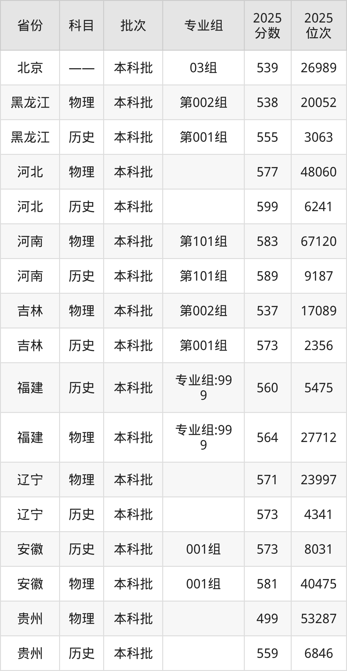 普通类本科物理类最低552分,本科历史类最低577分