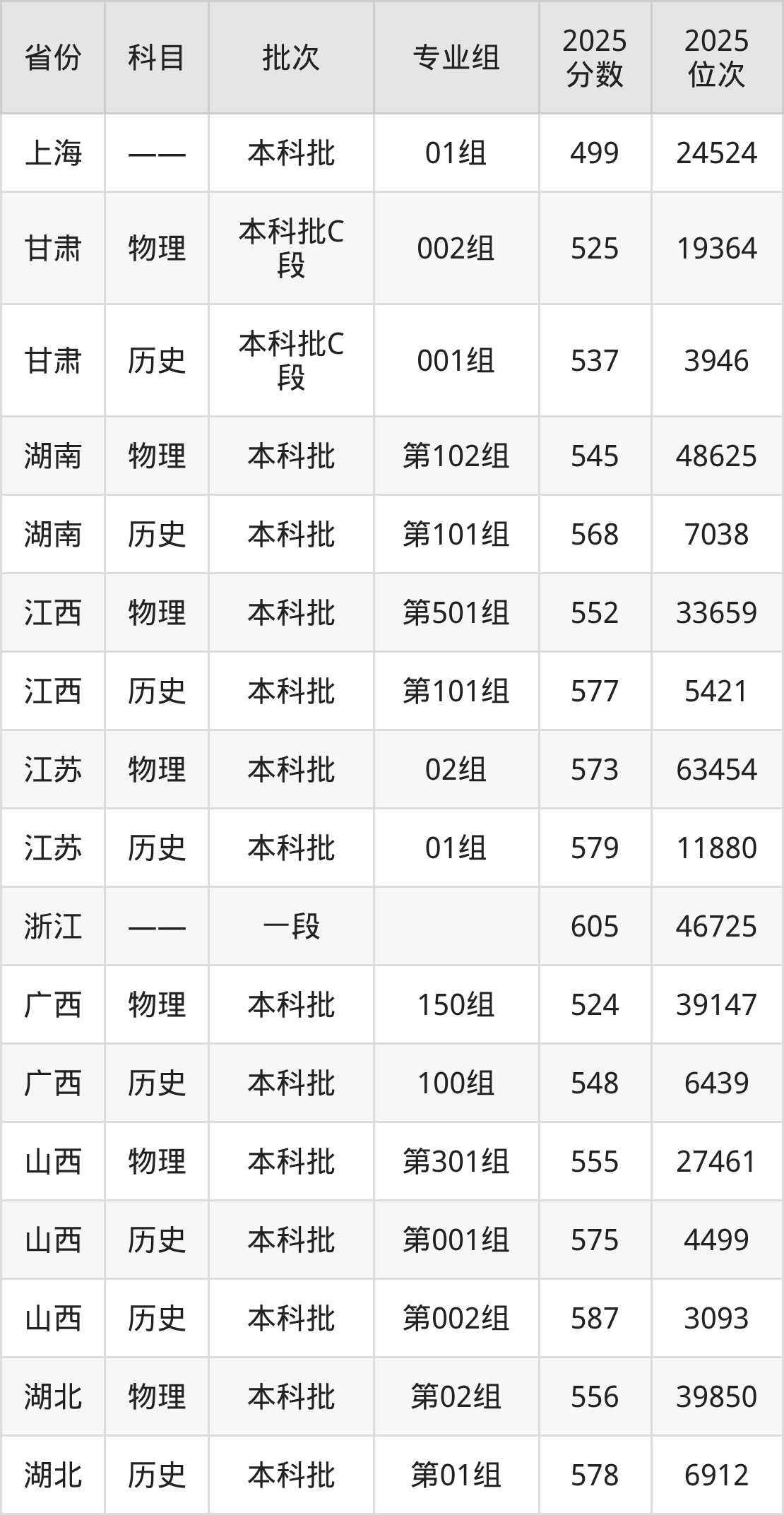 普通类本科物理类最低545分,本科历史类最低568分