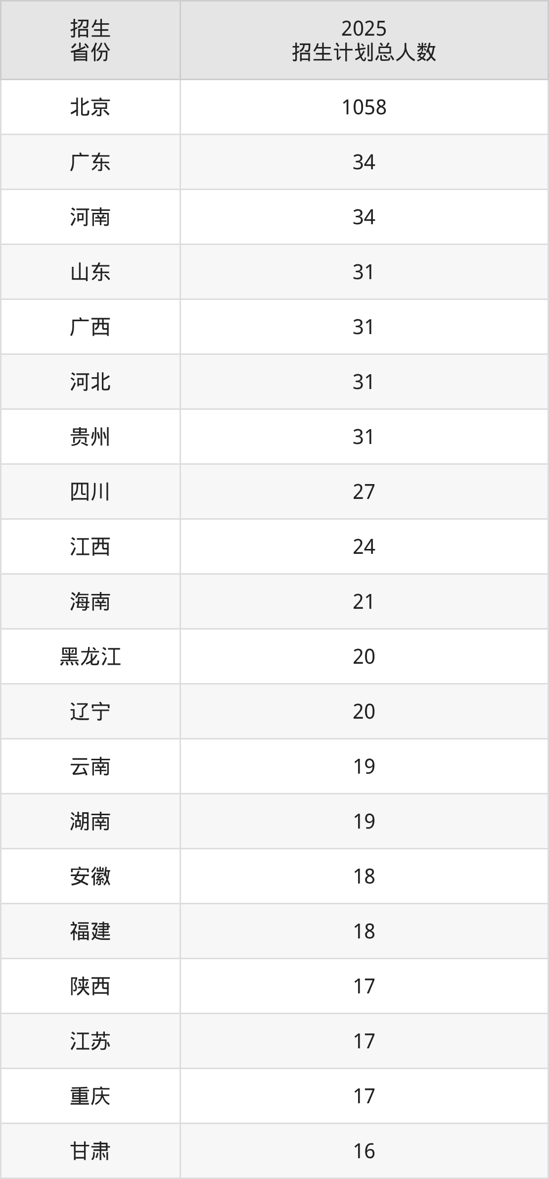 2025年北京第二外国语学院面向全国27个省市开展本科招生;招生专业共37个,招生人数共1587人。2025年在北京市招生计划总人数是1058人,其中,北京第二外国语学院在北京市招生人数最多的是英语。北京第二外国语学院在各省具体招生人数情况如下表。