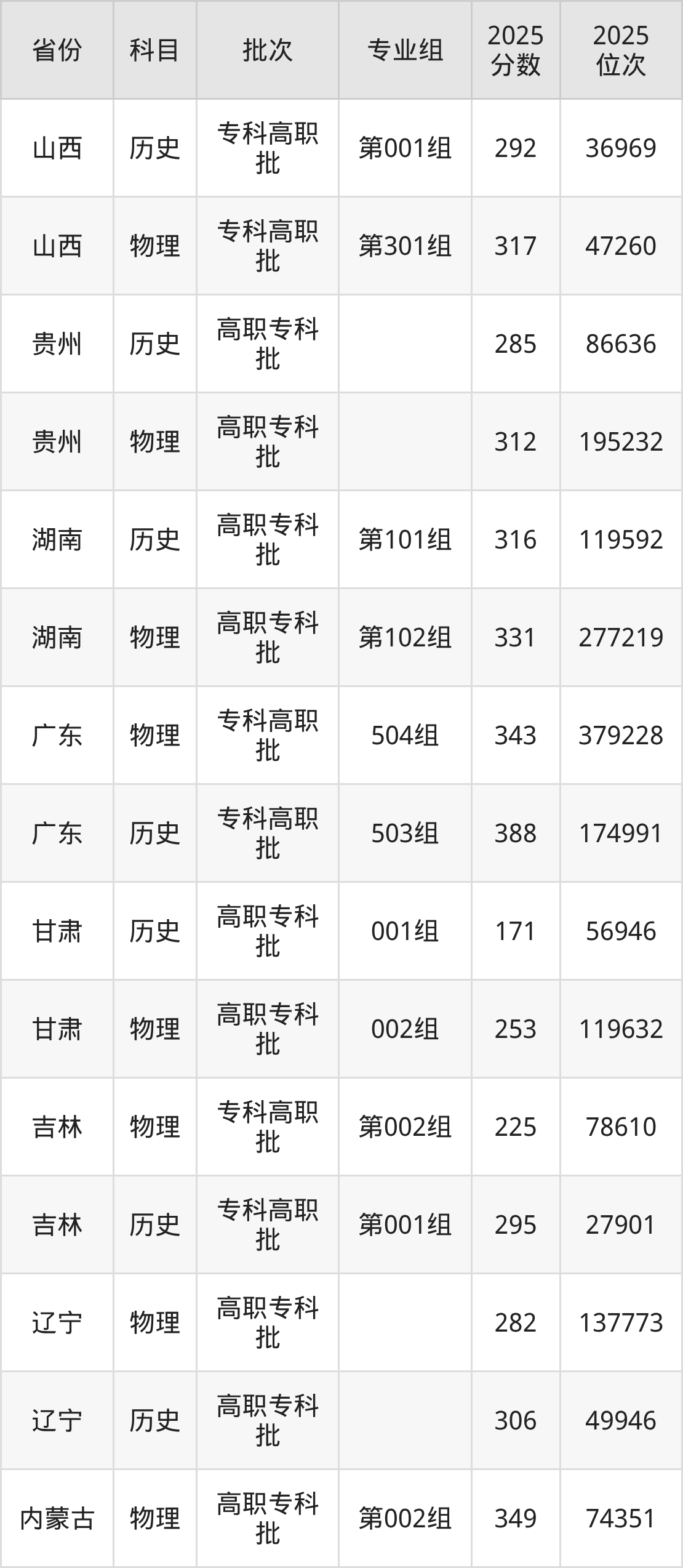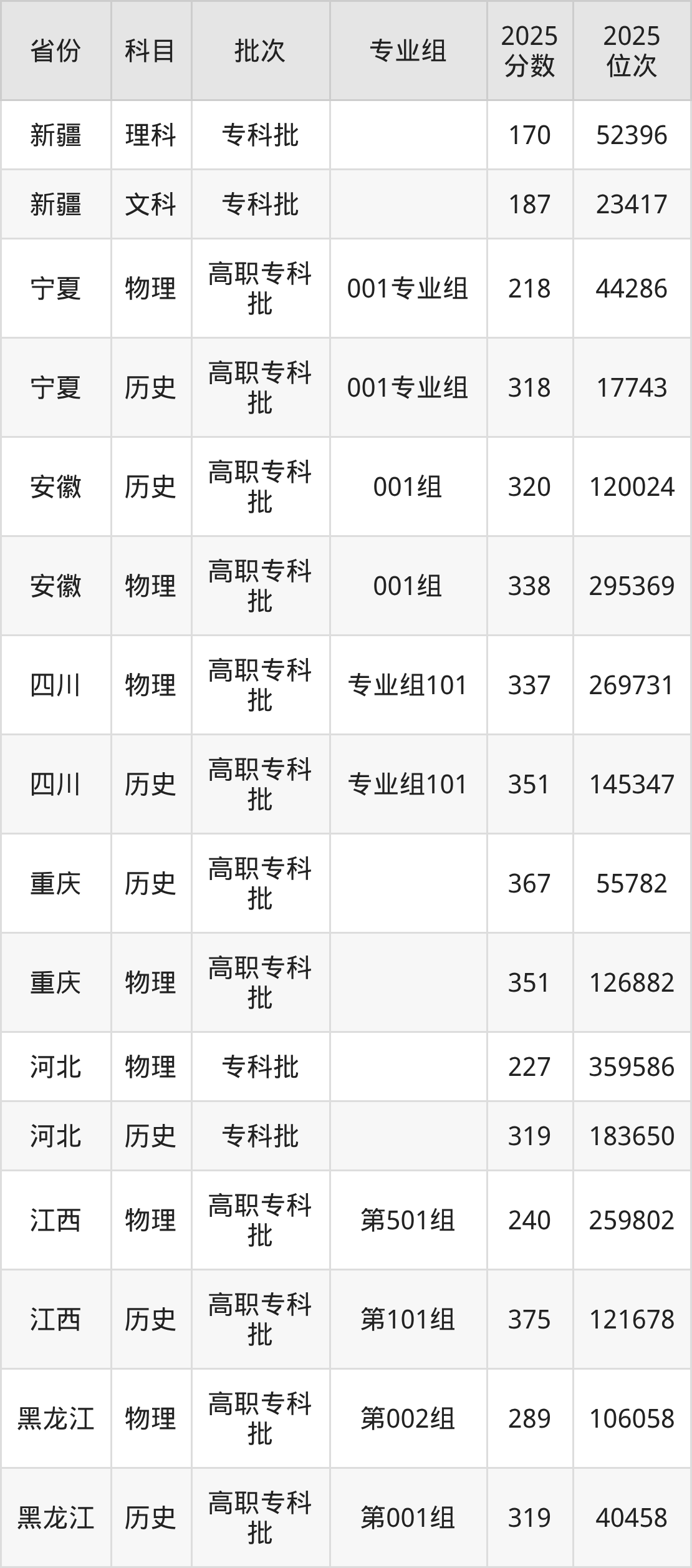 2025年在专科物理类进行招生,各专业组分数线详情如下: