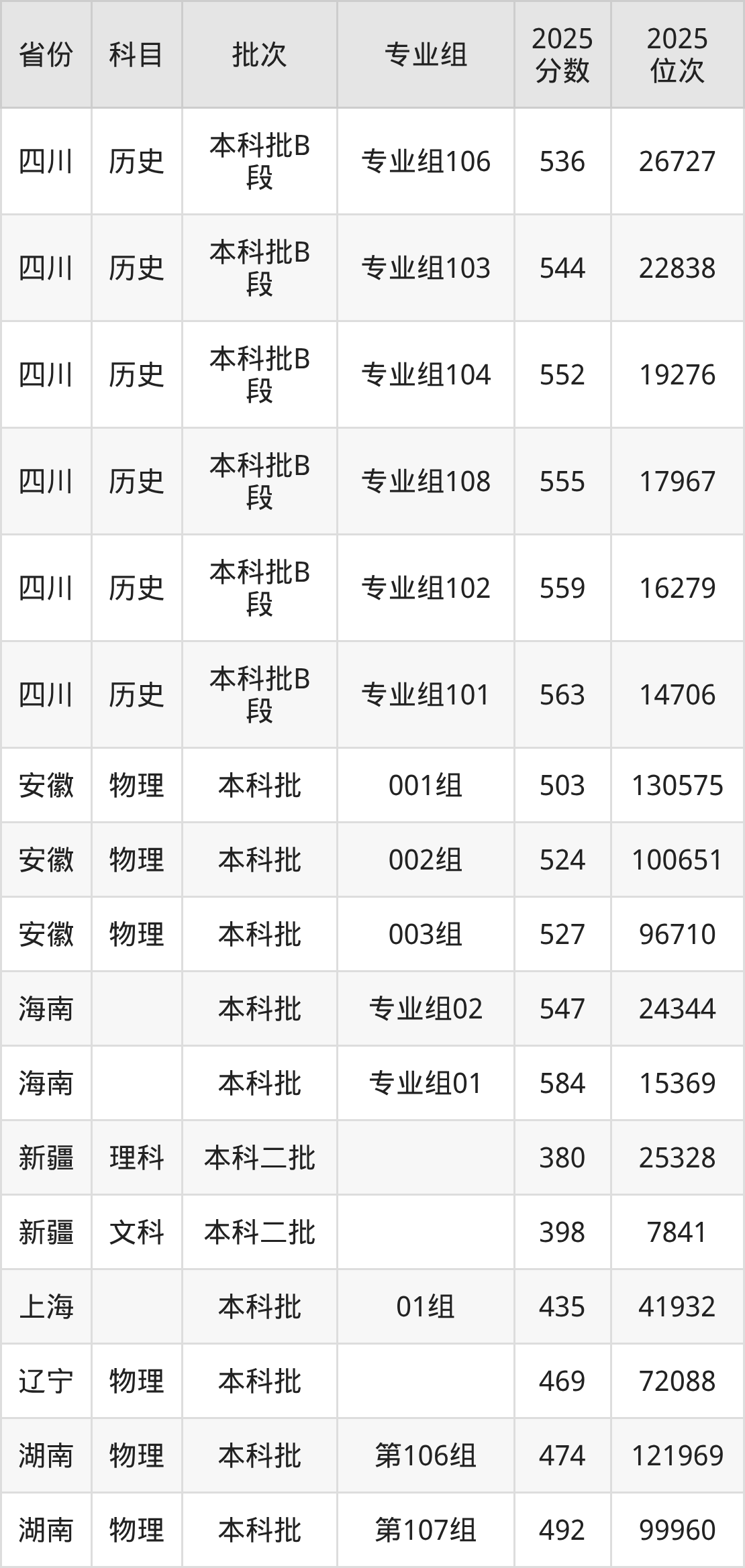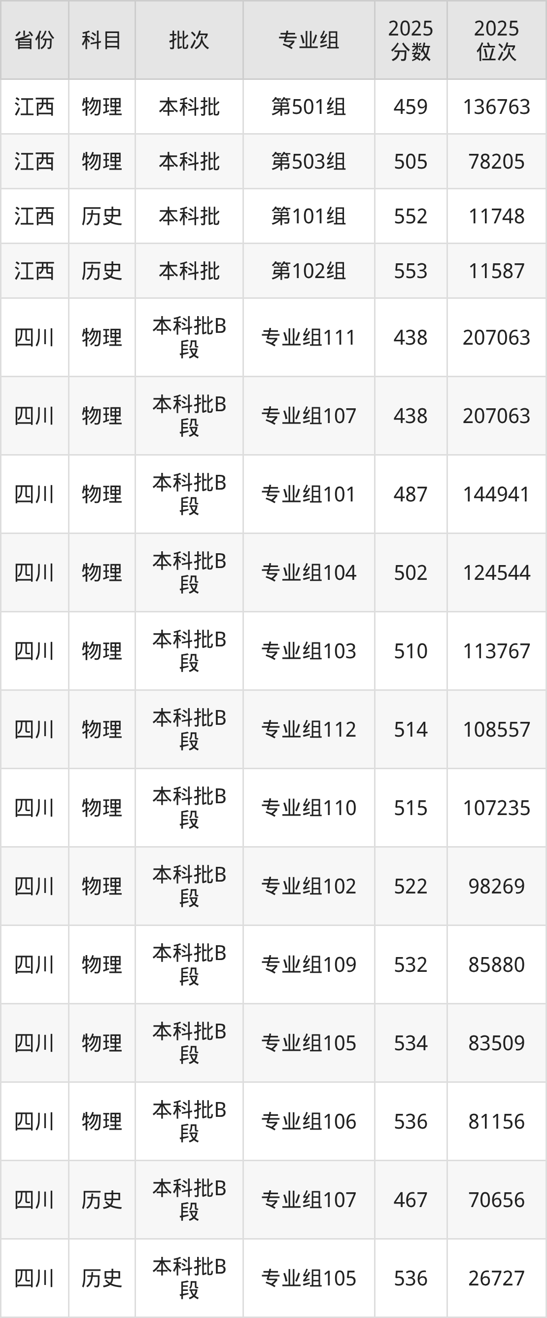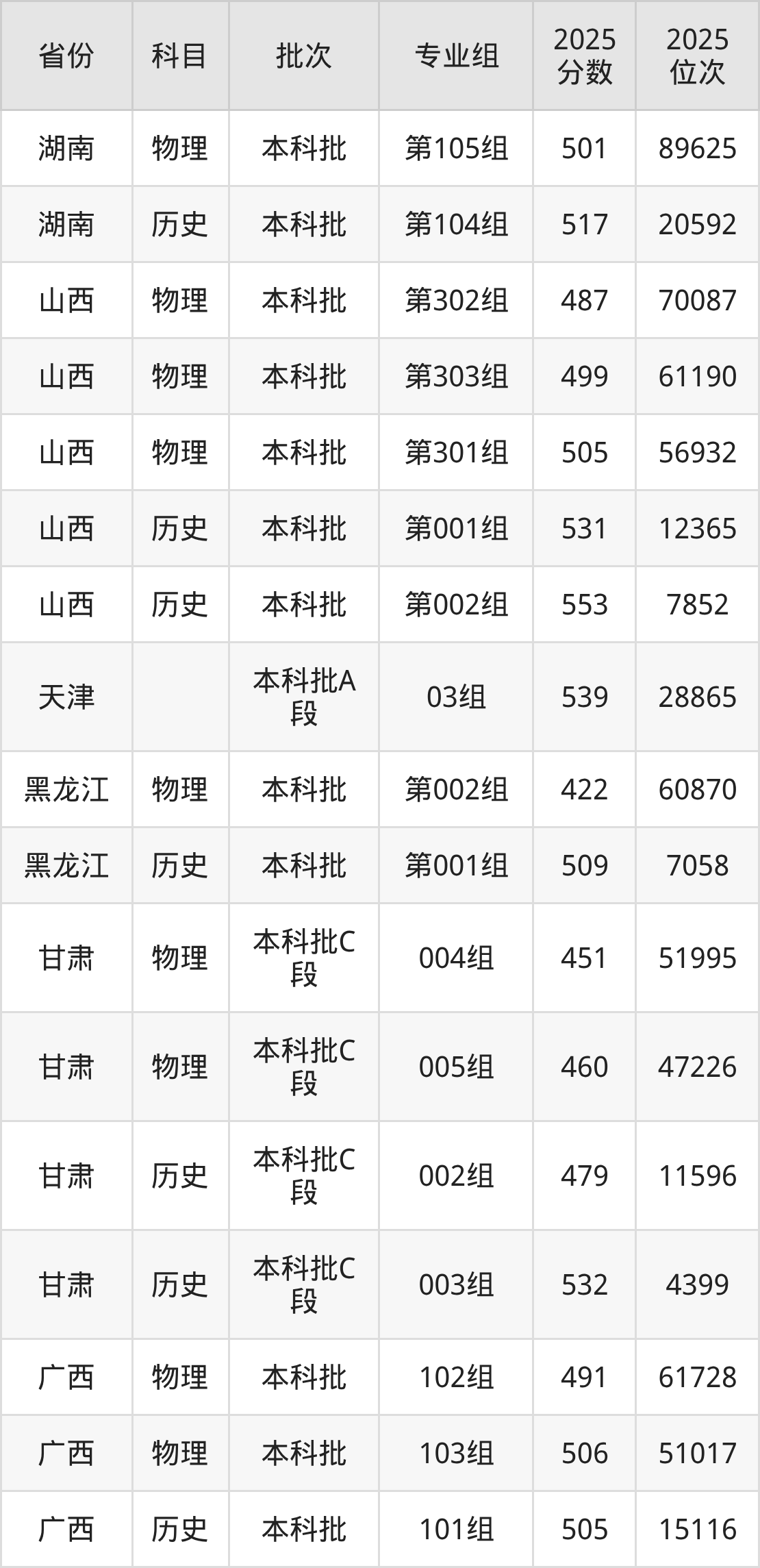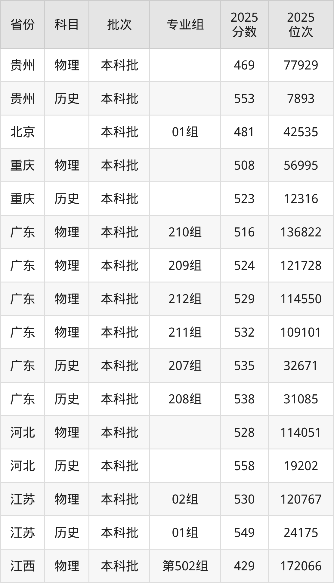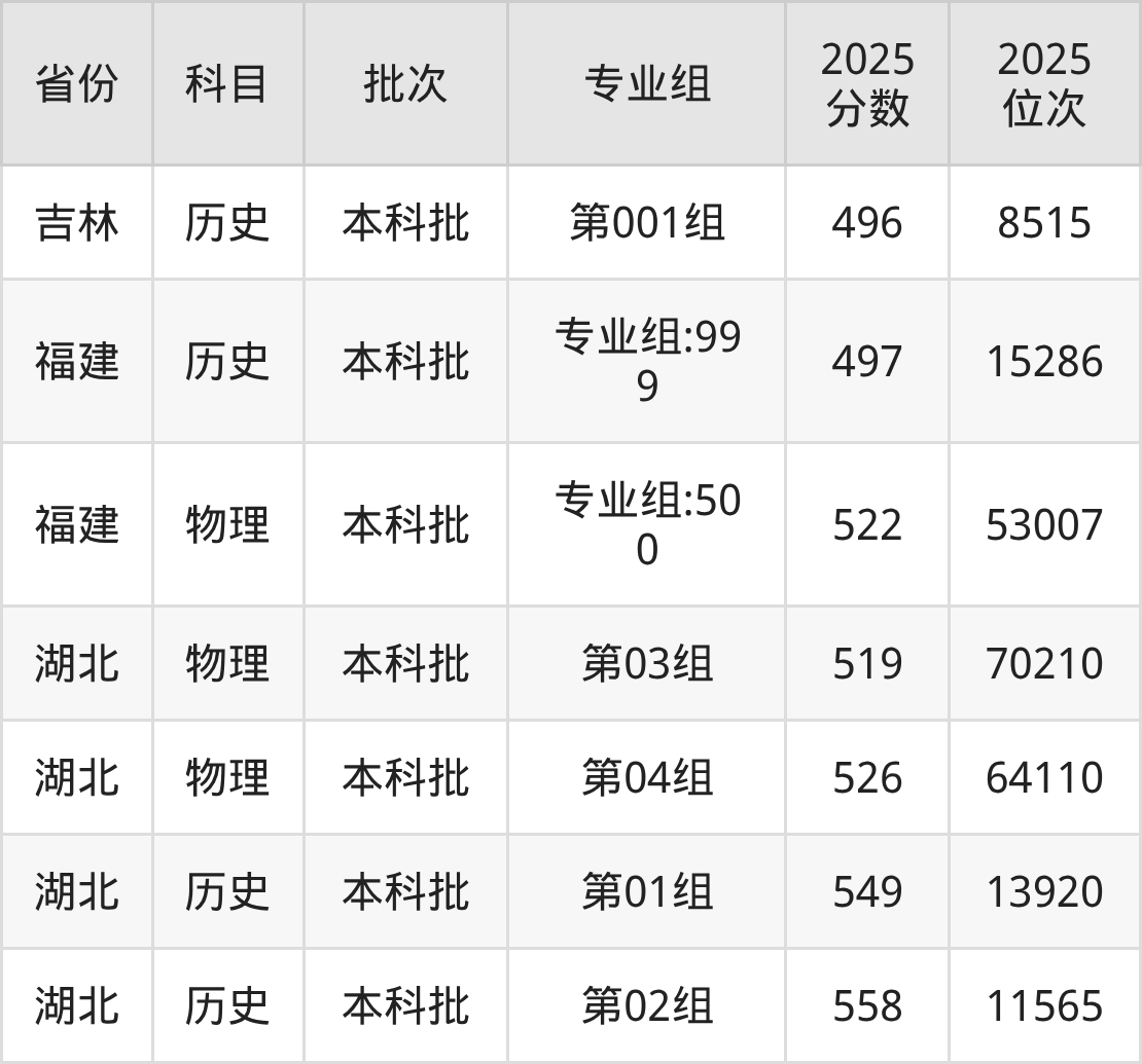 2025年在本科物理类进行招生,各专业组分数线详情如下: