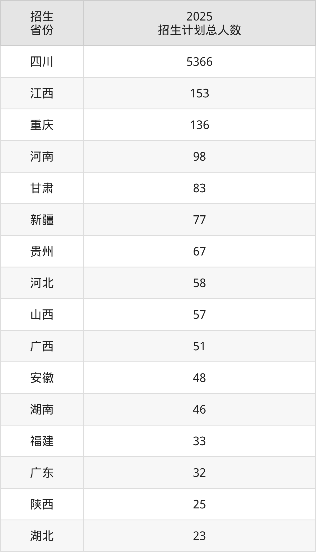 2025年西华师范大学面向全国25个省市开展本科招生;招生专业共56个,招生人数共6452人。2025年在四川省招生计划总人数是5366人,其中,西华师范大学在四川省招生人数最多的是汉语言文学。西华师范大学在各省具体招生人数情况如下表。
