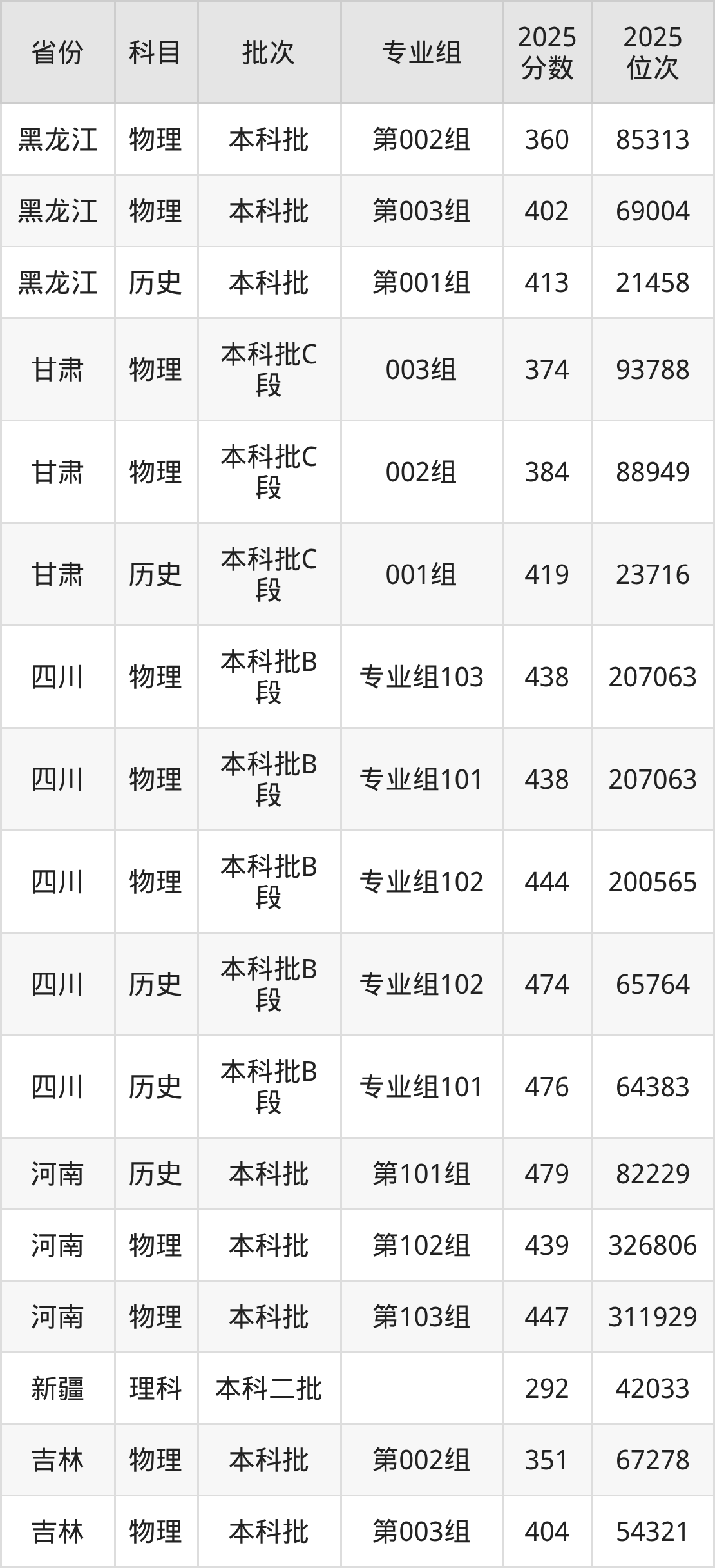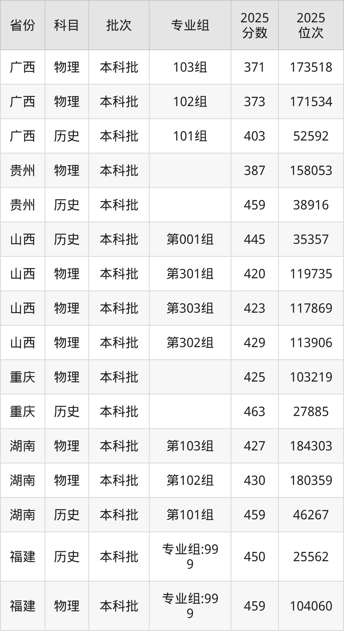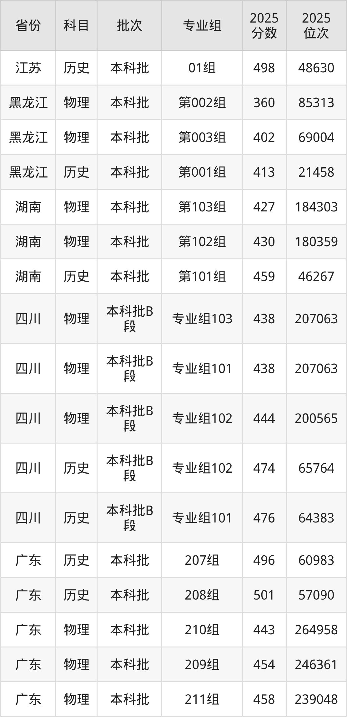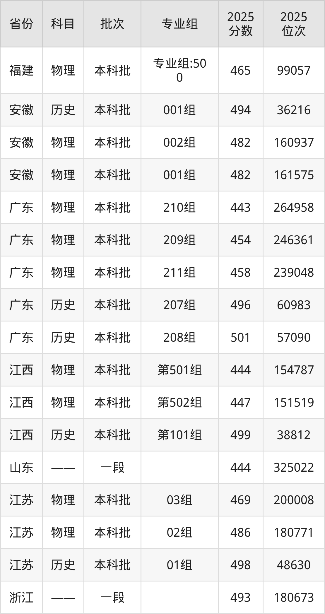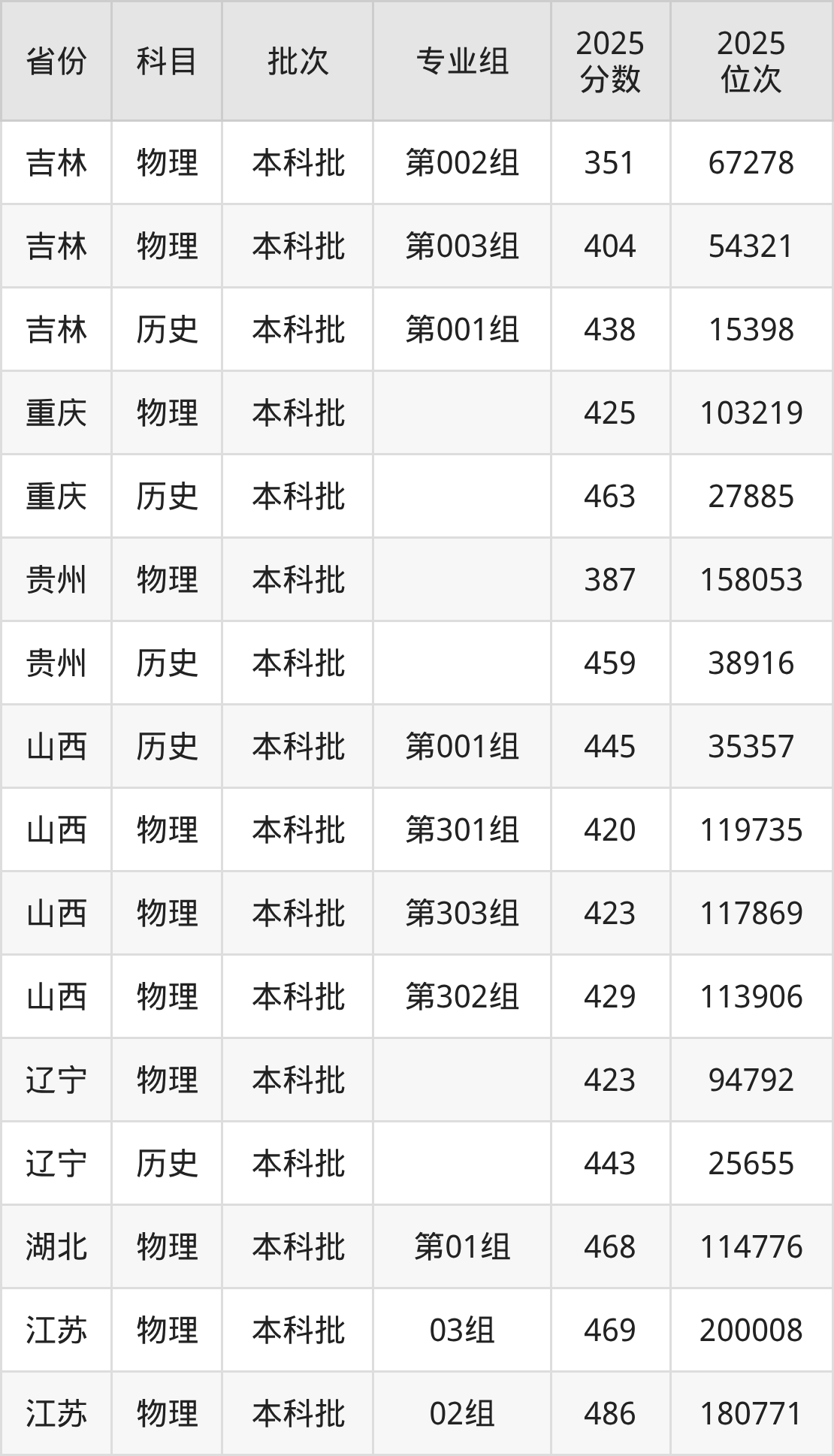 2025年在本科物理类进行招生,各专业组分数线详情如下: