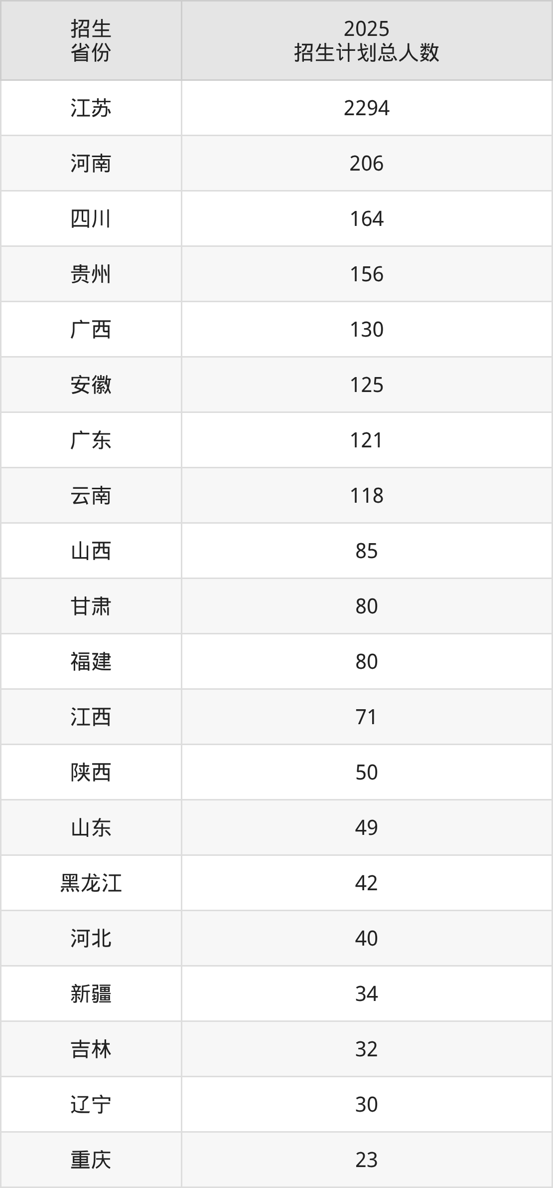 2025年三江学院面向全国22个省市开展本科招生;招生专业共38个,招生人数共3955人。2025年在江苏省招生计划总人数是2294人,其中,三江学院在江苏省招生人数最多的是电气工程及其自动化。三江学院在各省具体招生人数情况如下表。