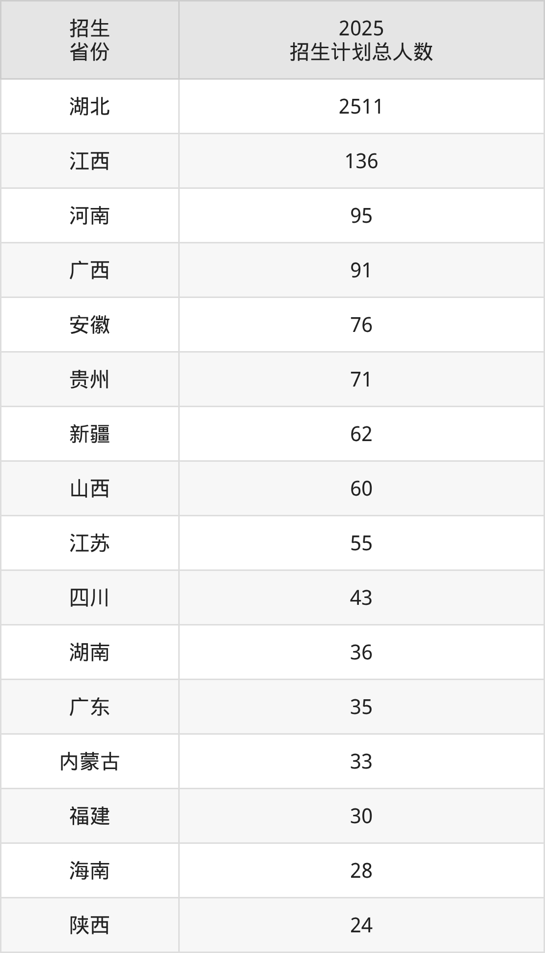 2025年武汉工商学院面向全国19个省市开展本科招生;招生专业共28个,招生人数共2107人。2025年在湖北省招生计划总人数是2511人,其中,武汉工商学院在湖北省招生人数最多的是环境工程。武汉工商学院在各省具体招生人数情况如下表。