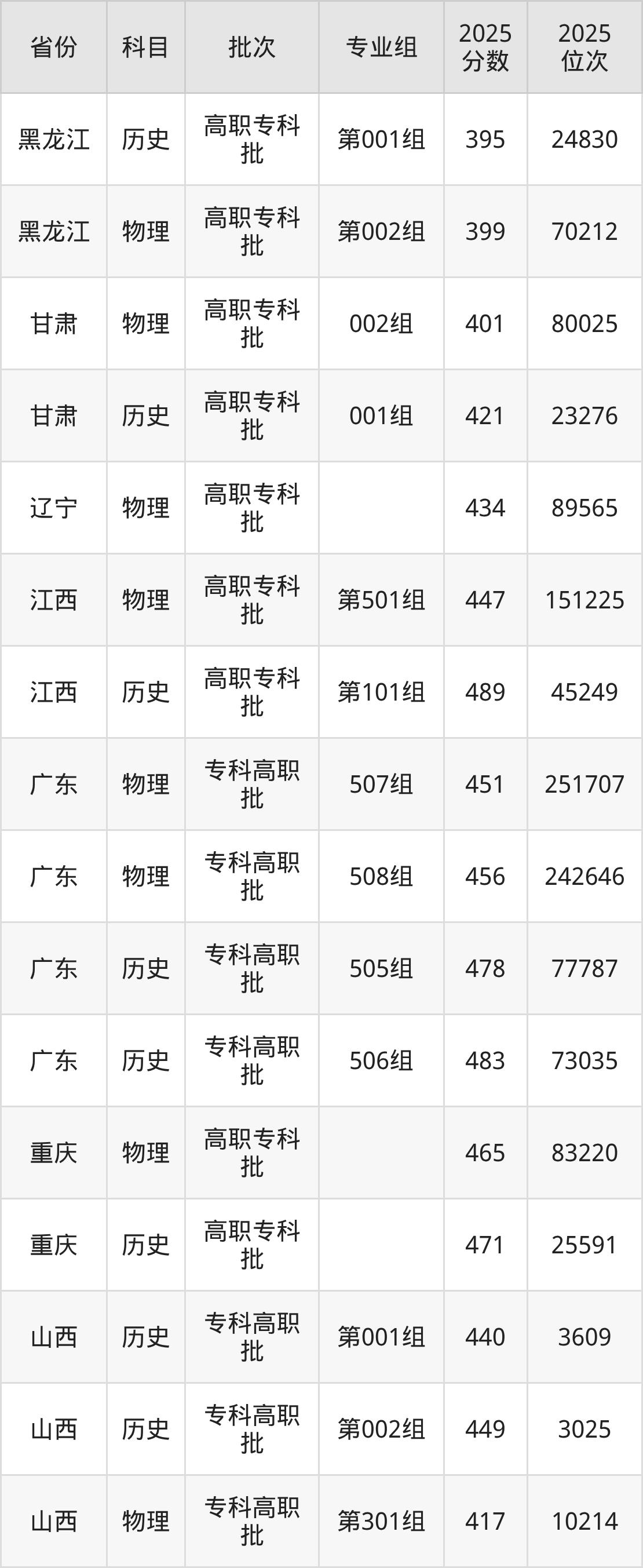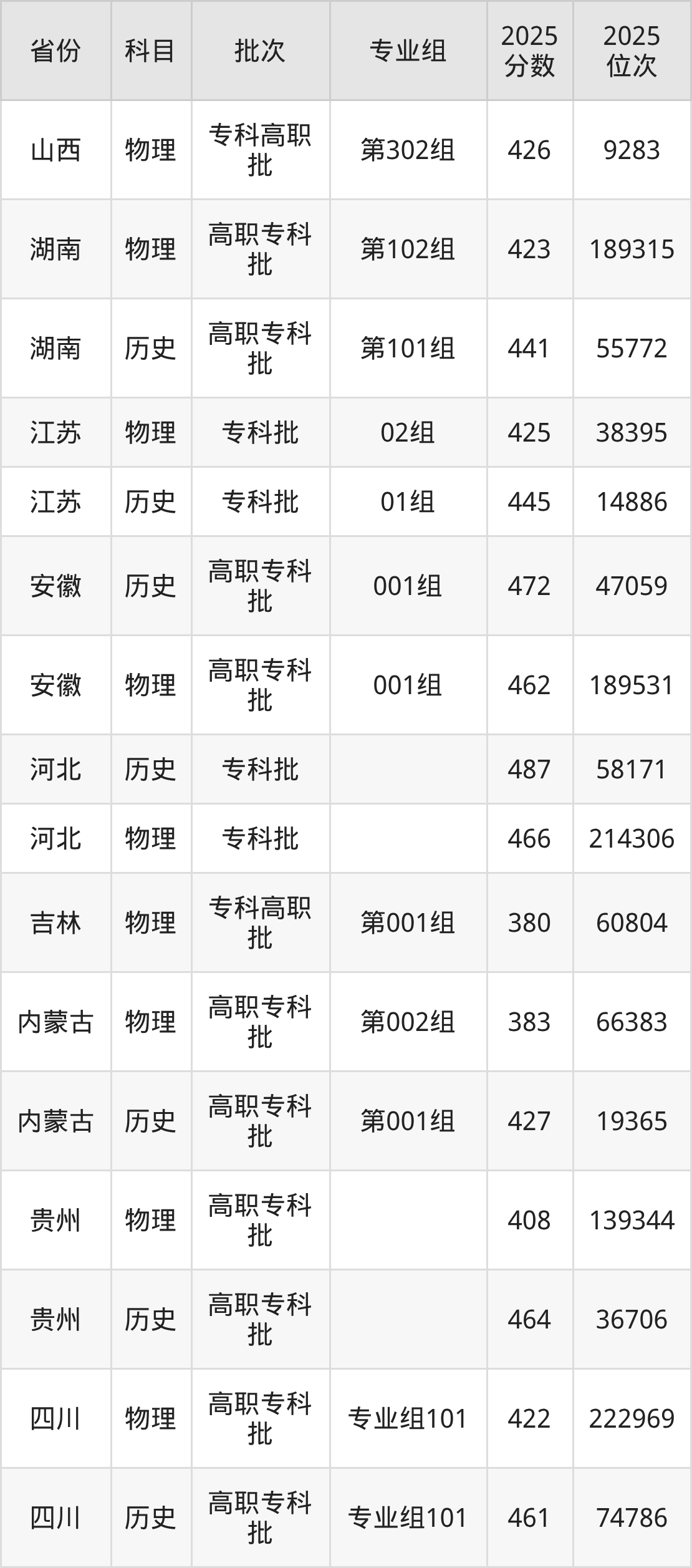 2025年在专科物理类进行招生,各专业组分数线详情如下: