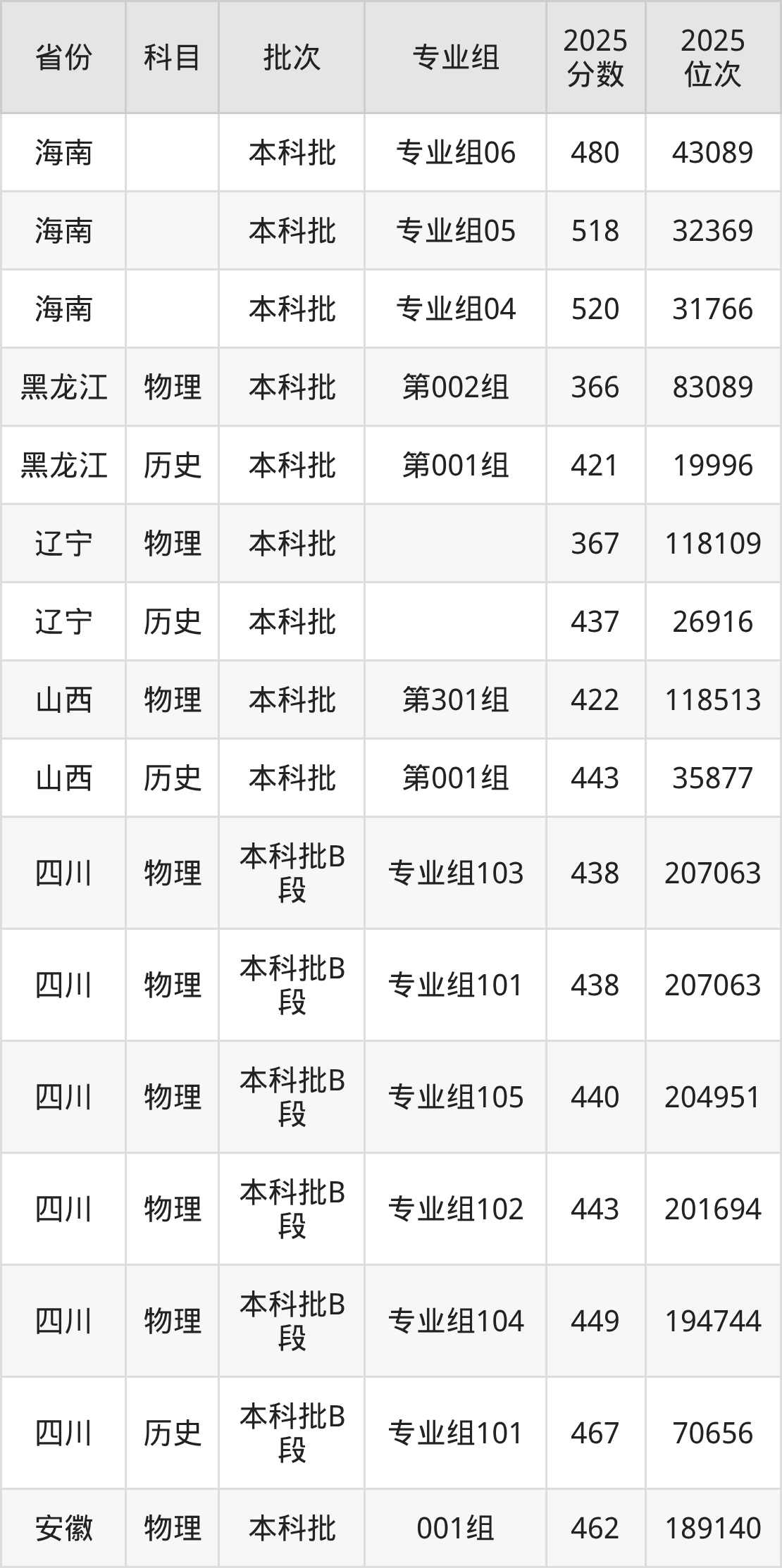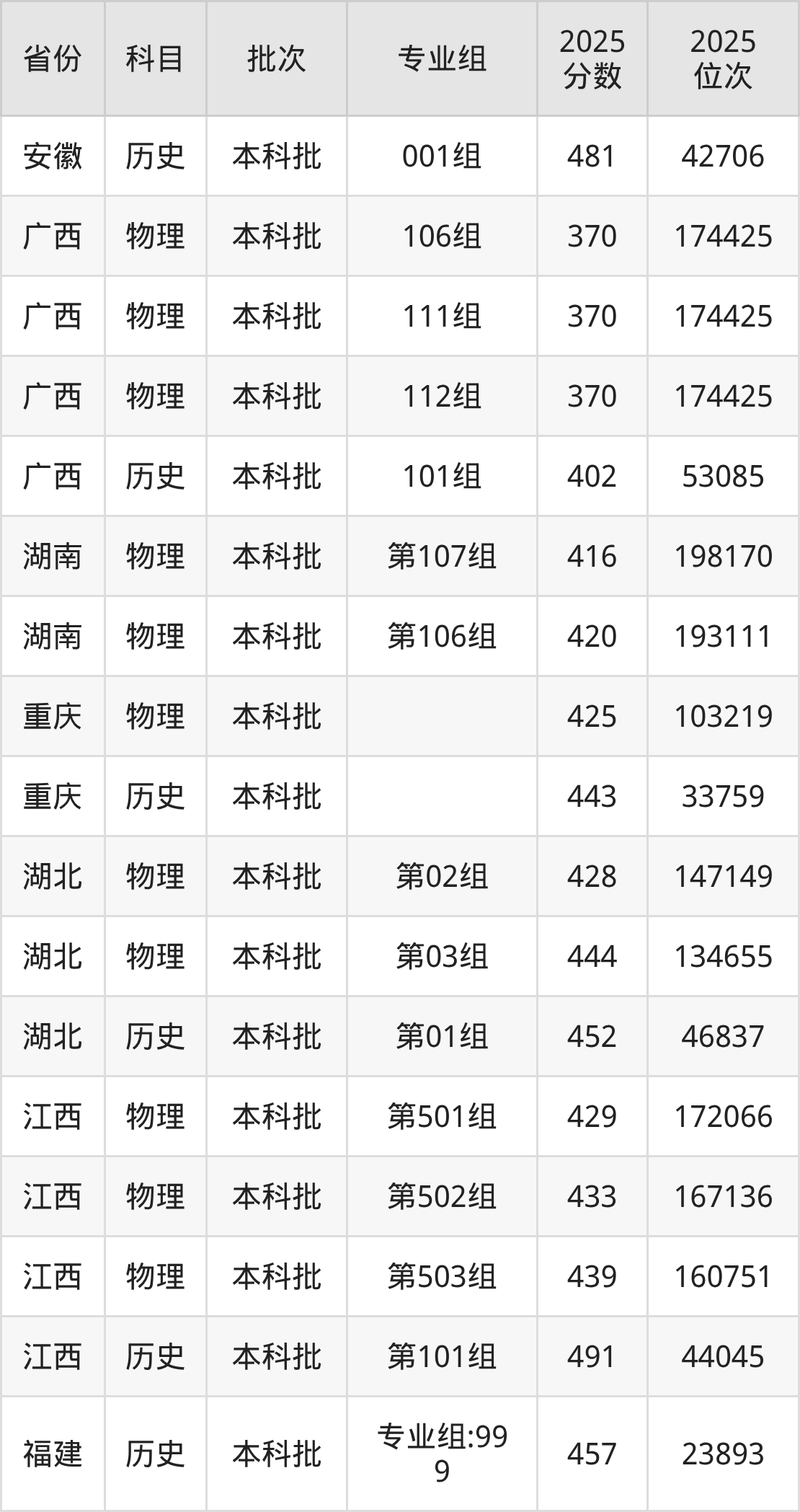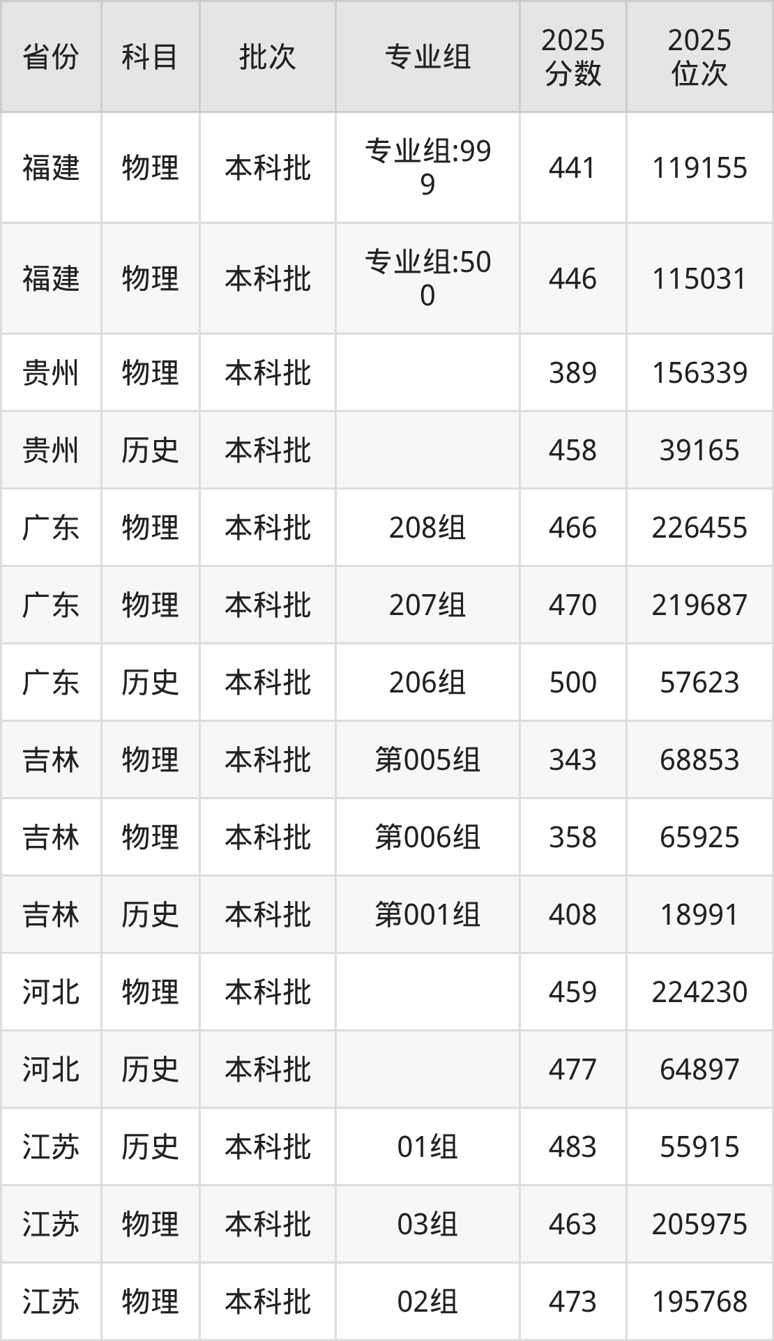 2025年在本科物理类进行招生,各专业组分数线详情如下:
