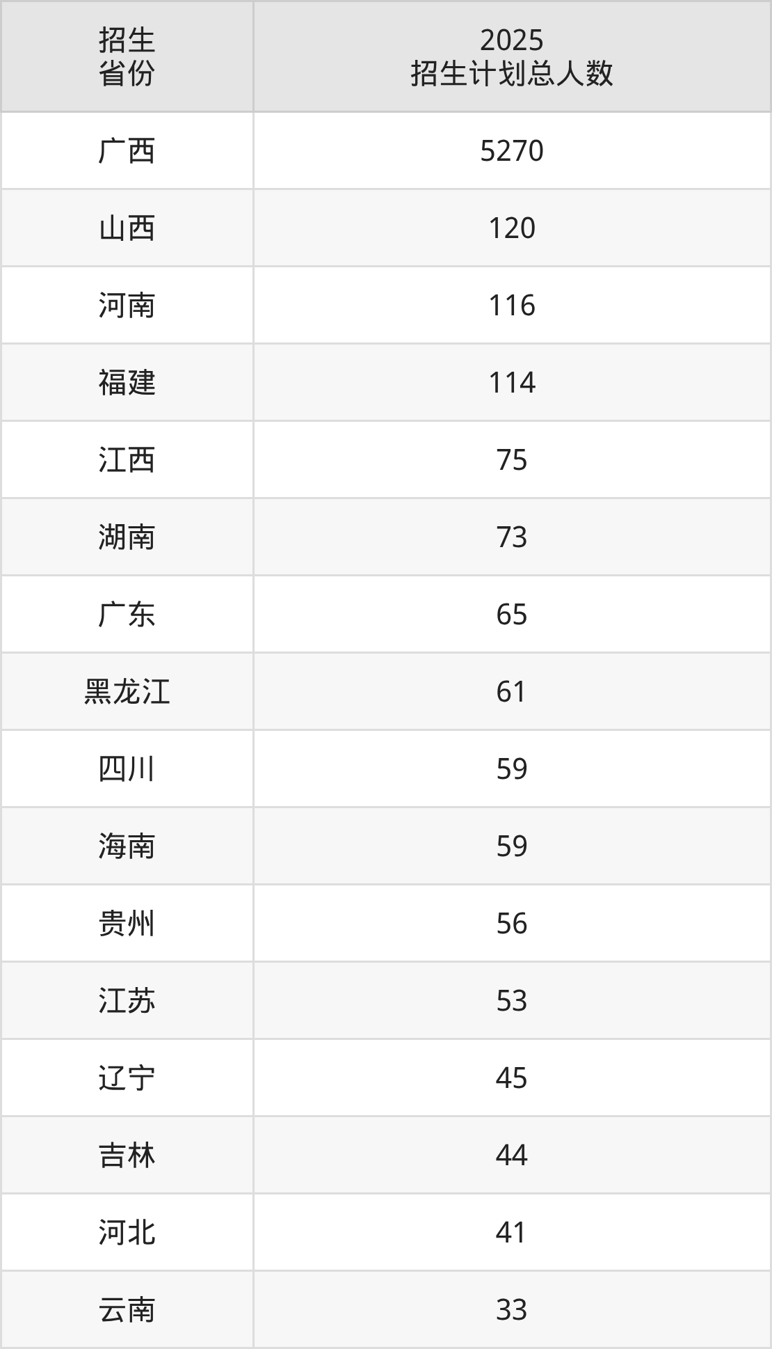 2025年广西外国语学院面向全国20个省市开展本科招生;招生专业共40个,招生人数共4344人。2025年在广西壮族自治区招生计划总人数是5270人,其中,广西外国语学院在广西壮族自治区招生人数最多的是汉语言文学。广西外国语学院在各省具体招生人数情况如下表。