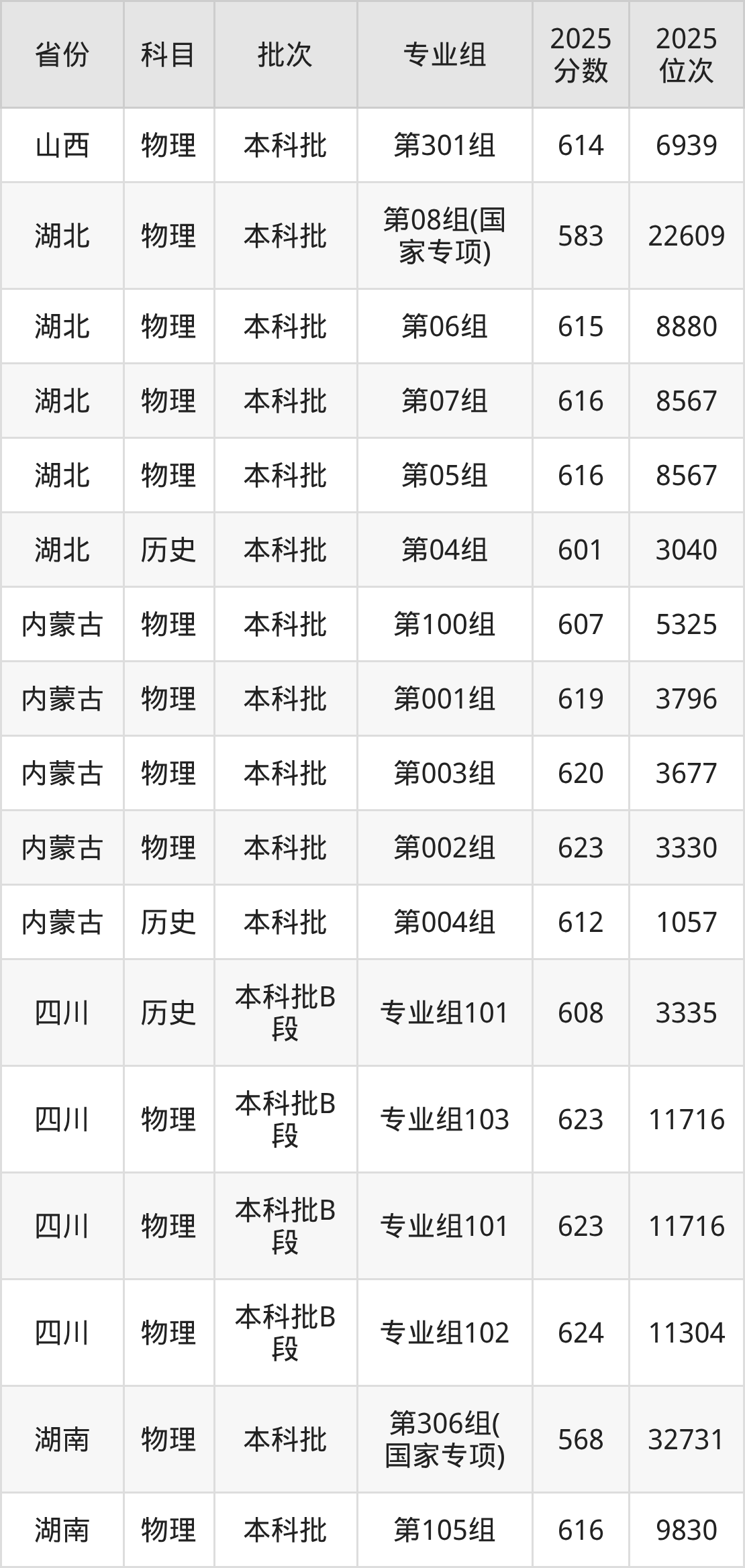 2025年在本科物理类进行招生,各专业组分数线详情如下:
