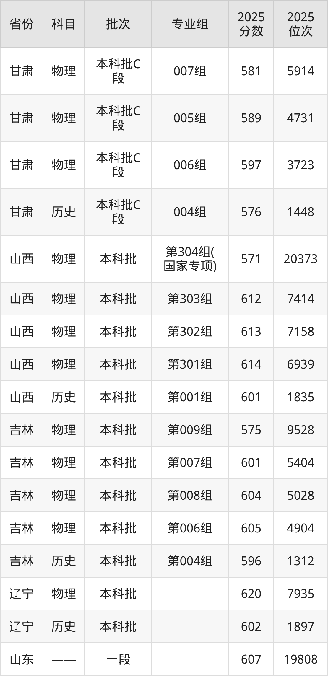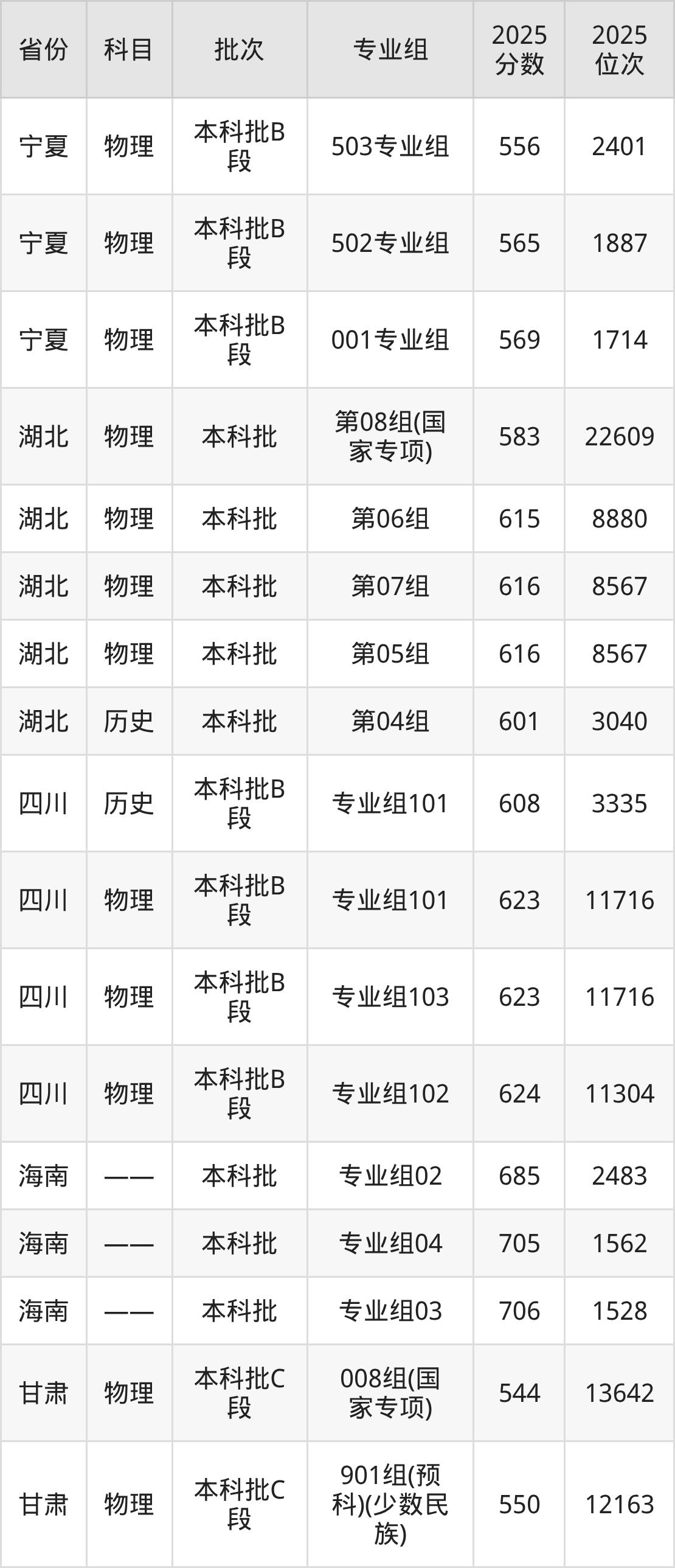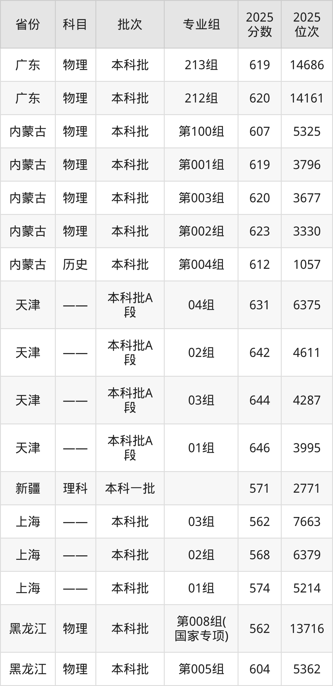 2025年在本科理科进行招生,各专业组分数线详情如下:
