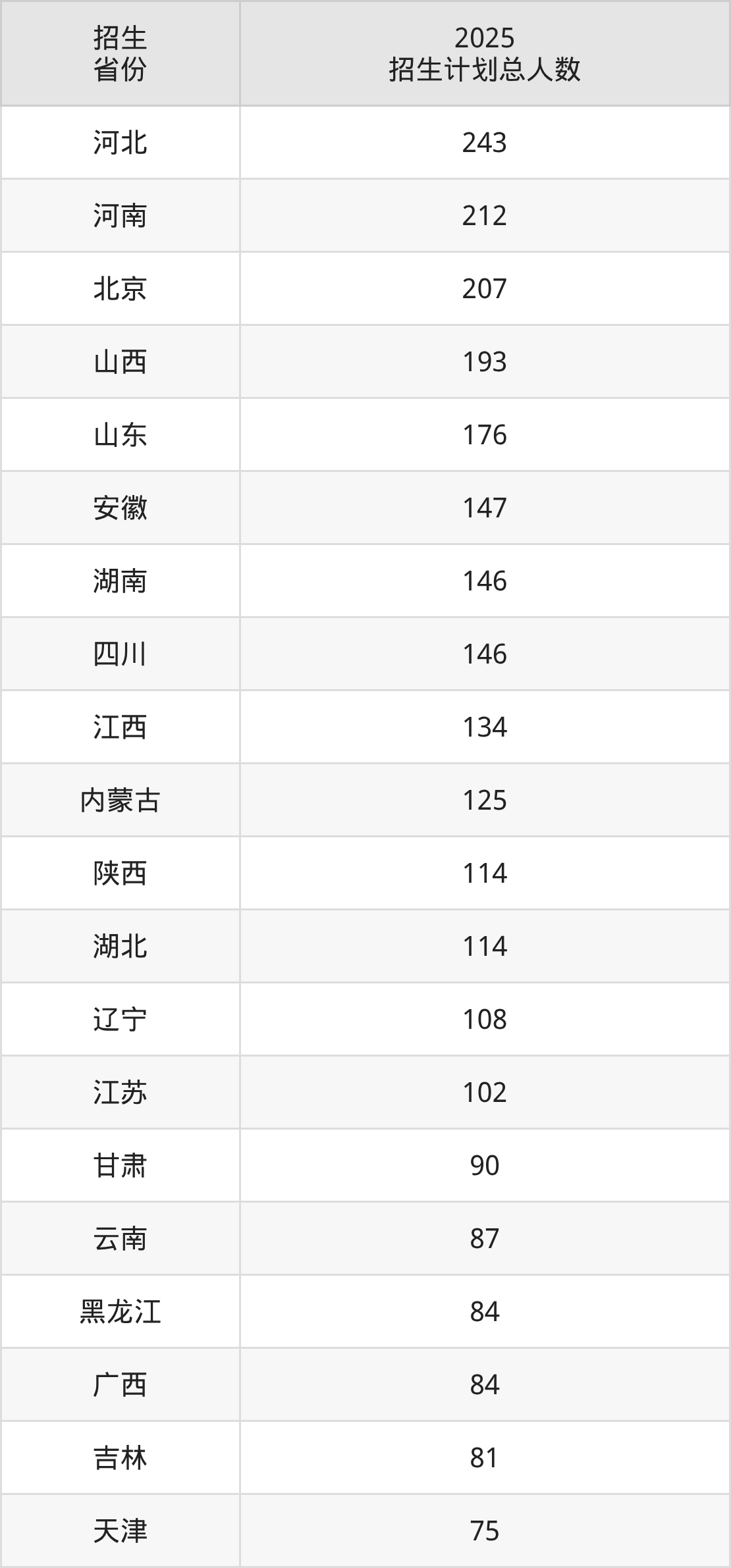 2025年北京科技大学面向全国29个省市开展本科招生;招生专业共28个,招生人数共3071人。2025年在北京市招生计划总人数是207人,其中,北京科技大学在北京市招生人数最多的是计算机类。北京科技大学在各省具体招生人数情况如下表。