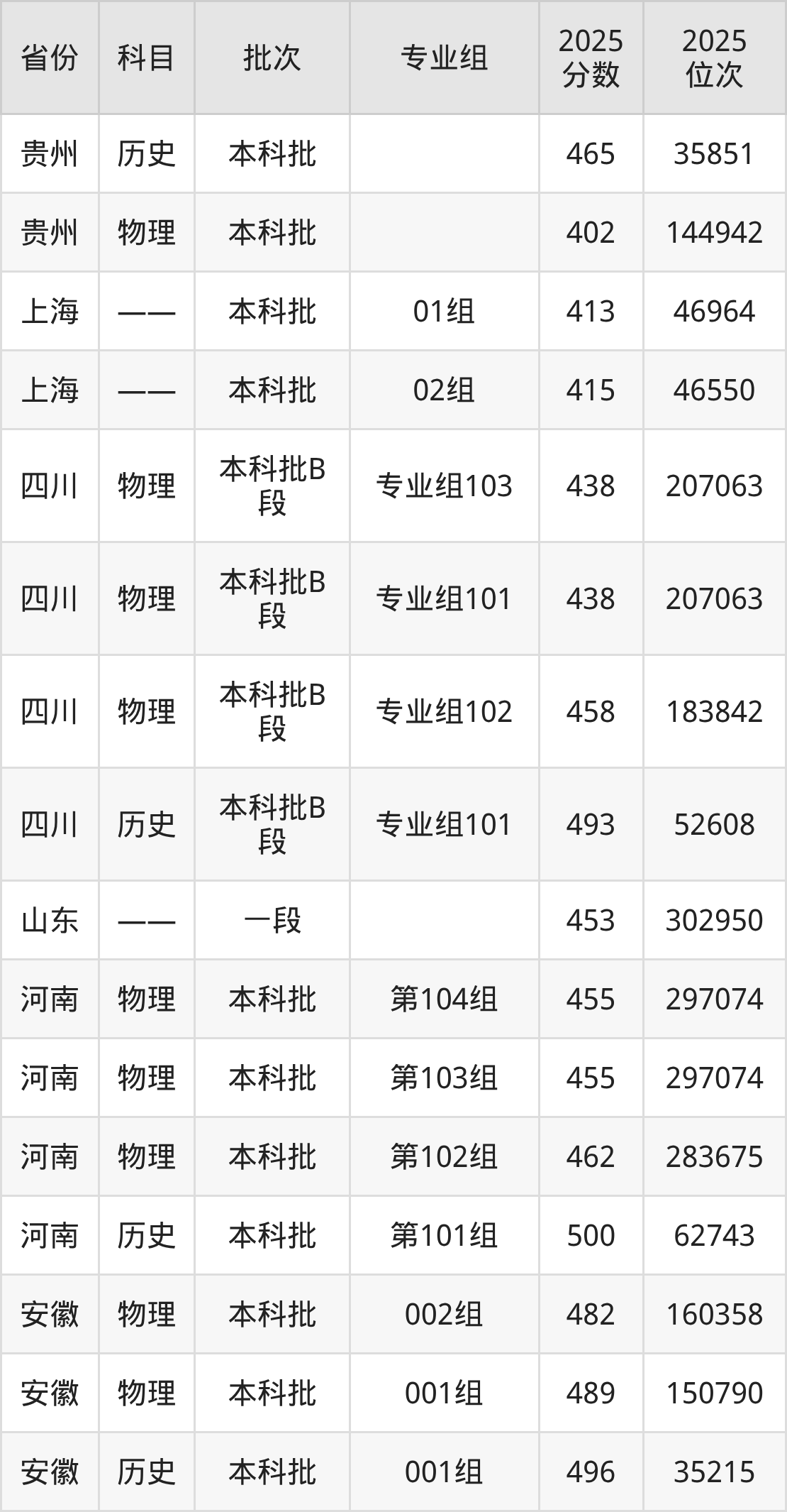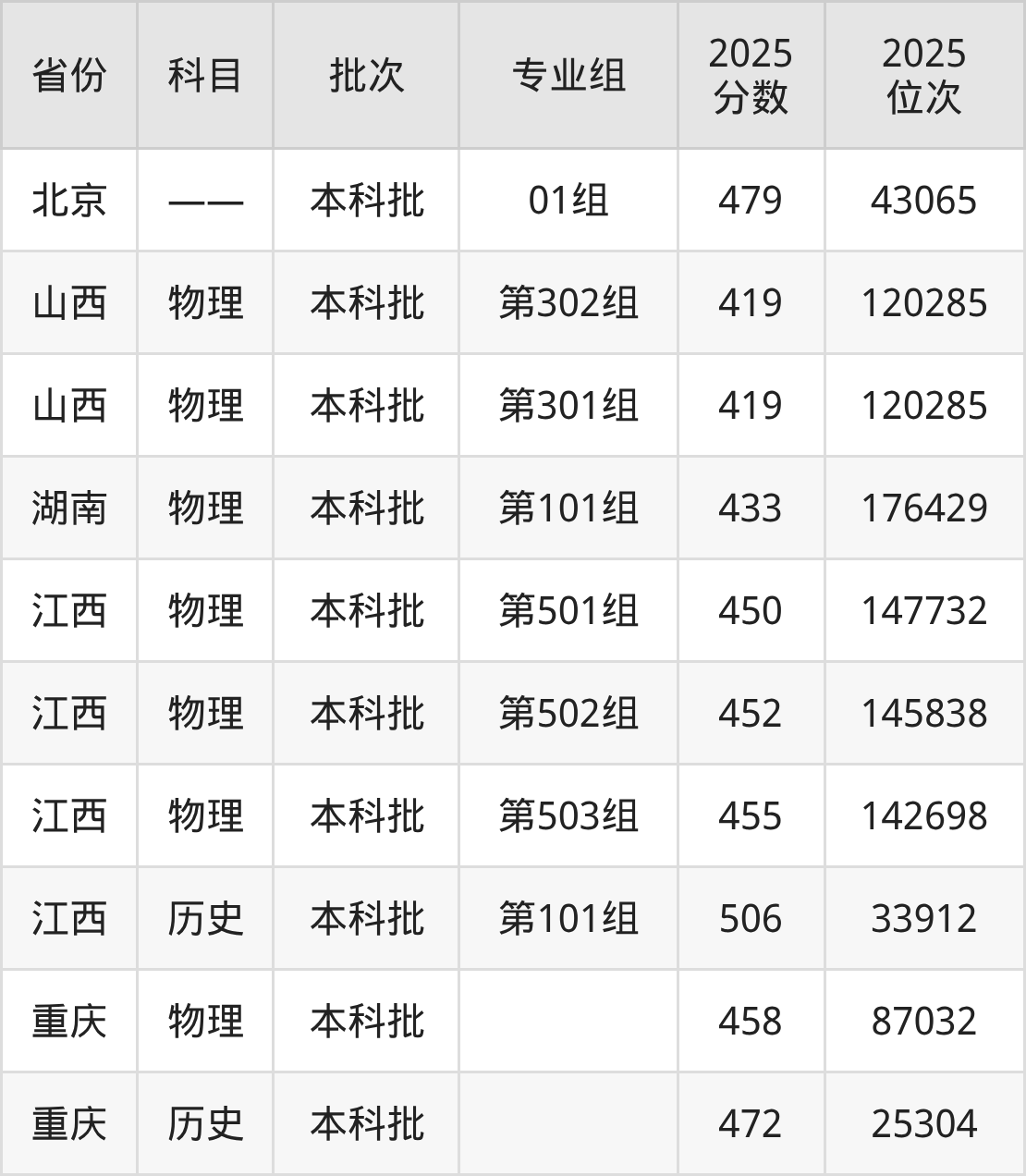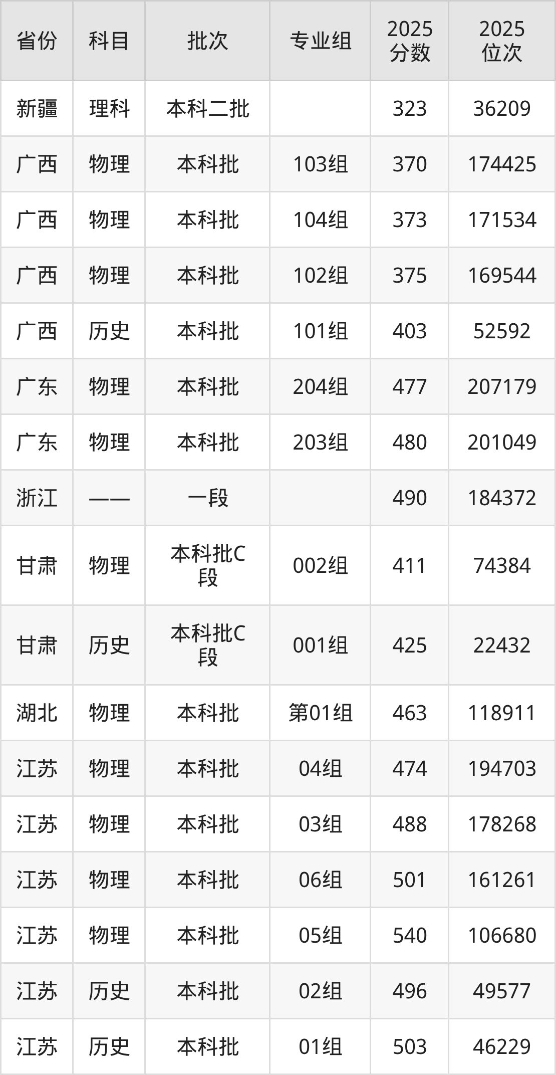 2025年在本科物理类进行招生,各专业组分数线详情如下: