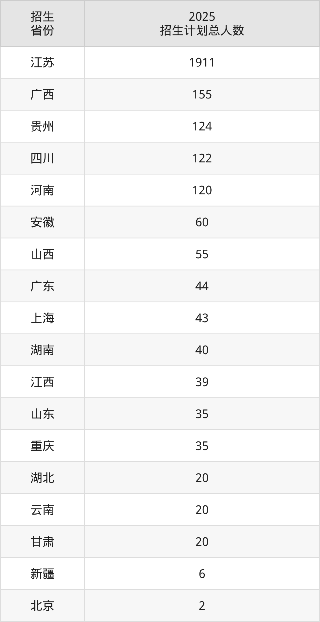 2025年南通大学杏林学院面向全国18个省市开展本科招生;招生专业共33个,招生人数共2851人。2025年在江苏省招生计划总人数是1911人,其中,南通大学杏林学院在江苏省招生人数最多的是自动化。南通大学杏林学院在各省具体招生人数情况如下表。