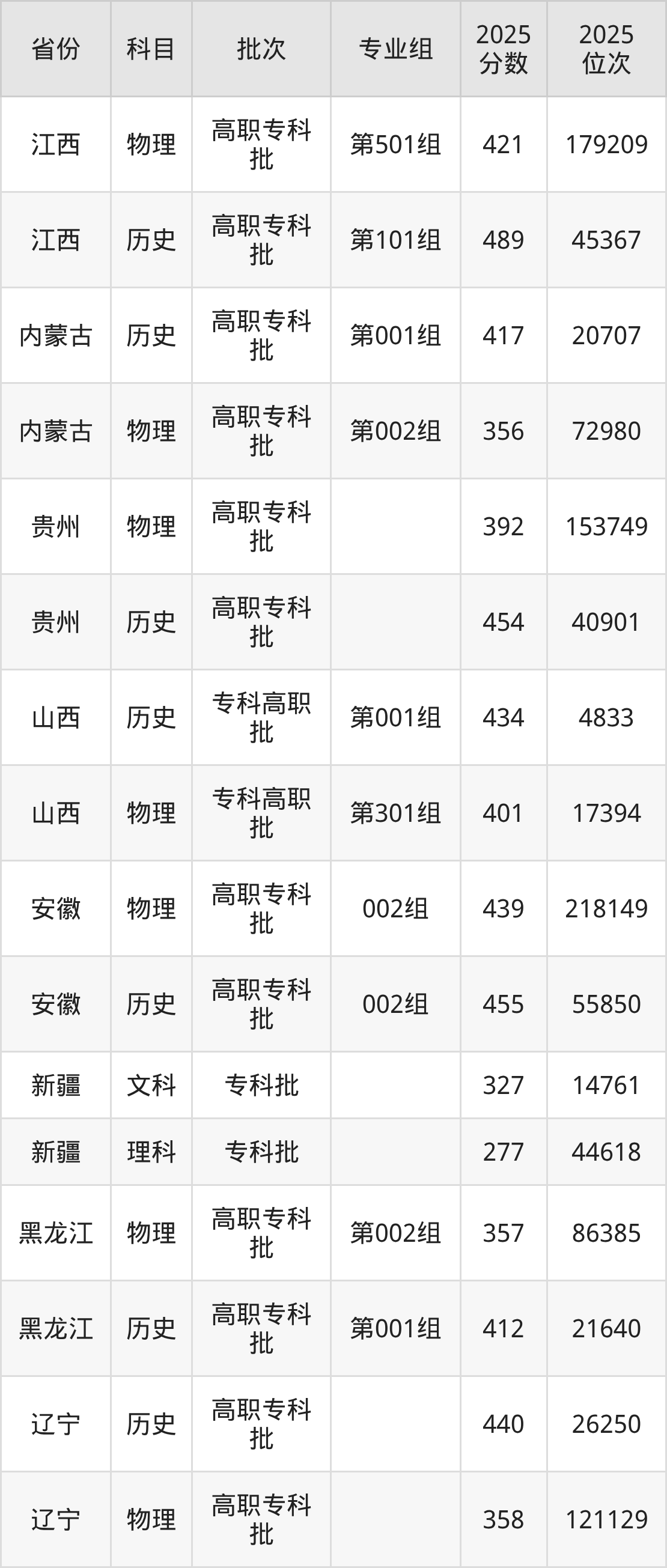普通类专科物理类最低421分,专科历史类最低489分